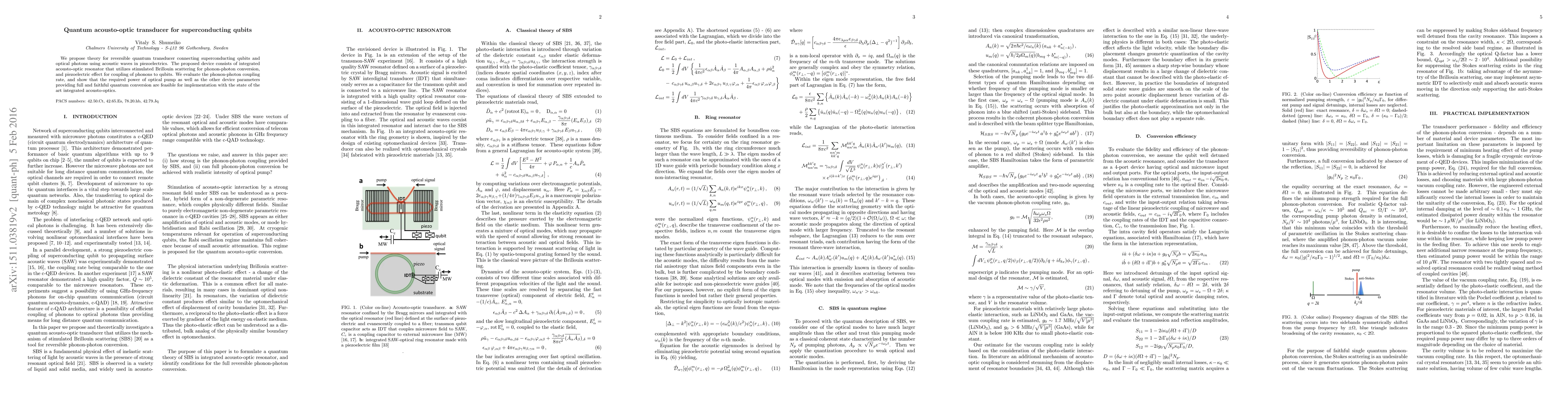 This paper proposes a theoretical framework for a reversible quantum transducer that connects superconducting qubits with optical photons via acoustic waves in piezoelectric materials. The device employs an integrated acousto-optic resonator that utilizes stimulated Brillouin scattering and the piezoelectric effect for phonon-photon conversion and qubit coupling, demonstrating feasible implementation parameters with current technology.