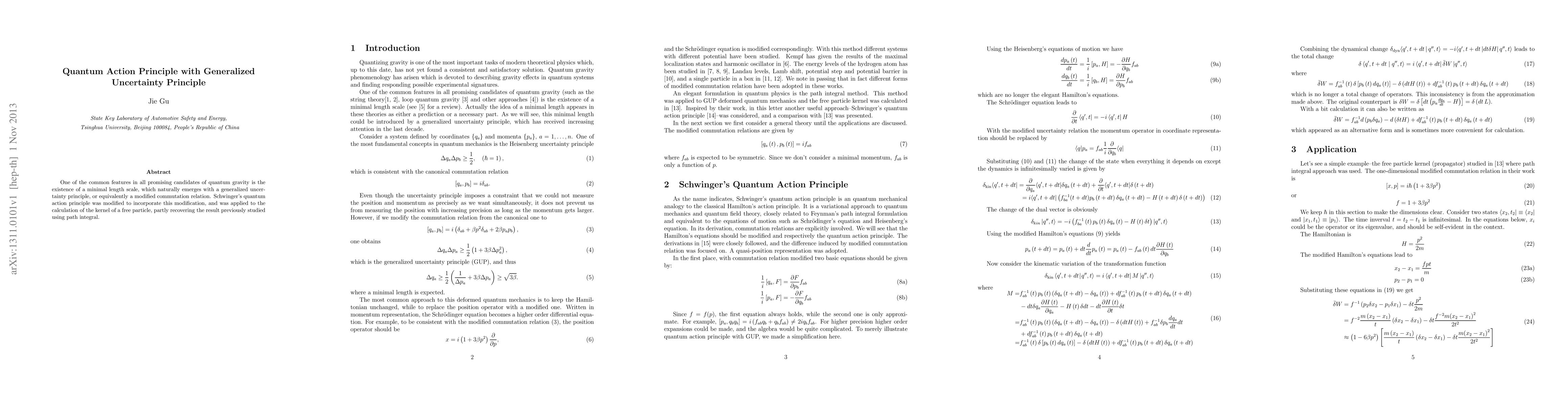 This paper modifies Schwinger's quantum action principle to include a generalized uncertainty principle, reflecting a minimal length scale, and applies it to calculate the kernel for a free particle, partially corroborating earlier path integral results.