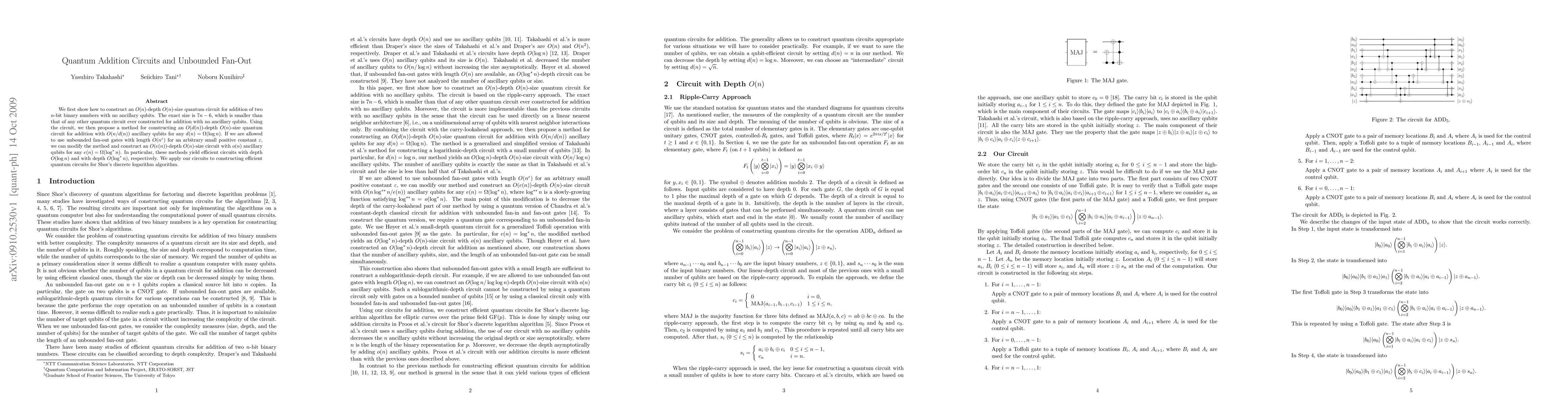 We first show how to construct an O(n)-depth O(n)-size quantum circuit for addition of two n-bit binary numbers with no ancillary qubits. The exact size is 7n-6, which is smaller than that of any other quantum circuit ever constructed for addition with no ancillary qubits. Using the circuit, we then propose a method for constructing an O(d(n))-depth O(n)-size quantum circuit for addition with O(n/d(n)) ancillary qubits for any d(n)=\Omega(log n). If we are allowed to use unbounded fan-out gates with length O(n^c) for an arbitrary small positive constant c, we can modify the method and construct an O(e(n))-depth O(n)-size circuit with o(n) ancillary qubits for any e(n)=\Omega(log* n). In particular, these methods yield efficient circuits with depth O(log n) and with depth O(log* n), respectively. We apply our circuits to constructing efficient quantum circuits for Shor's discrete logarithm algorithm.