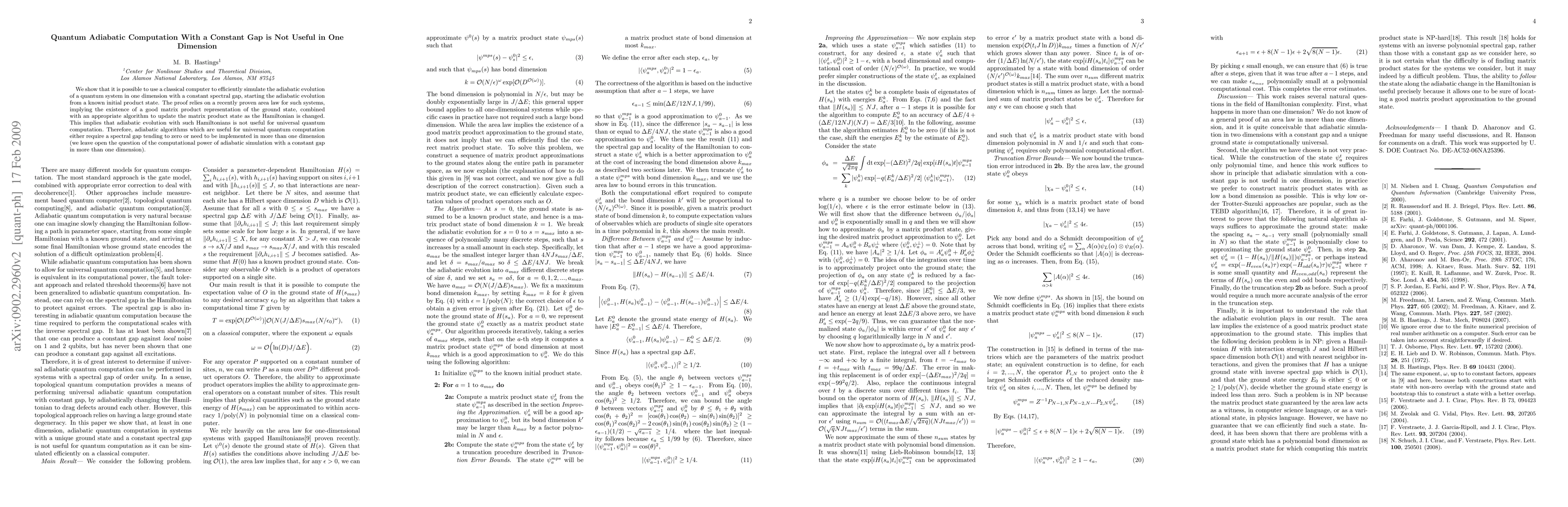 This paper demonstrates that simulating adiabatic quantum computation in one dimension with a constant spectral gap is efficiently achievable using classical computers, thus rendering such computations ineffective for universal quantum computation. The conclusion is drawn from a combination of an area law and a matrix product state algorithm.