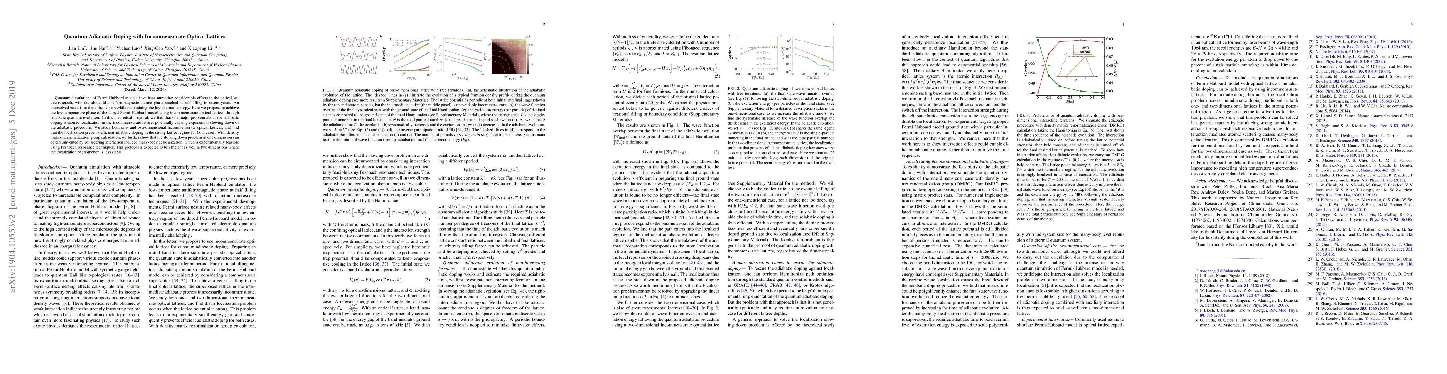 This paper proposes a method for adiabatic quantum doping in Fermi-Hubbard models using incommensurate optical lattices, addressing the challenge of maintaining low thermal entropy during doping. It finds that atomic localization in such lattices hinders efficient doping, but suggests that interaction-induced many-body delocalization, achievable via Feshbach resonance, can mitigate this issue in one dimension.