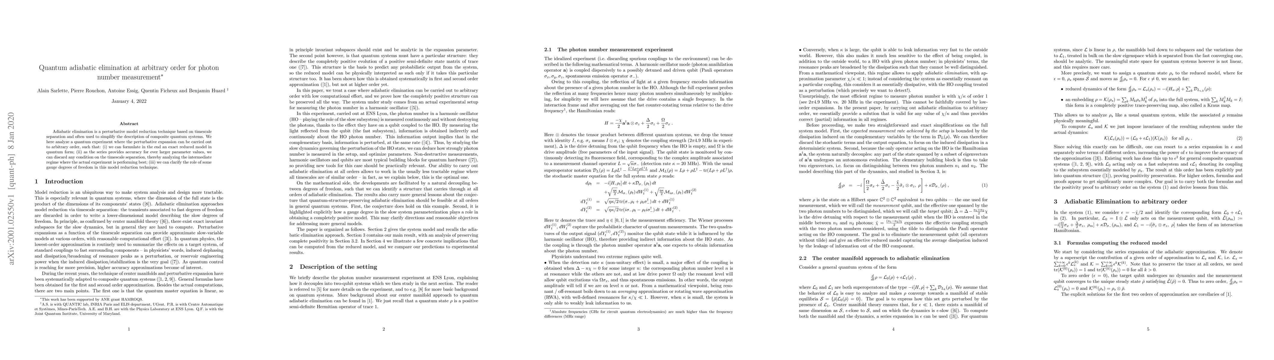 This paper develops a new method for quantum adiabatic elimination that allows for arbitrary order expansion, enabling the creation of an exact reduced model in quantum form. This breakthrough enables analysis of the intermediate regime where the experiment performs best, without restrictions on timescale separation.