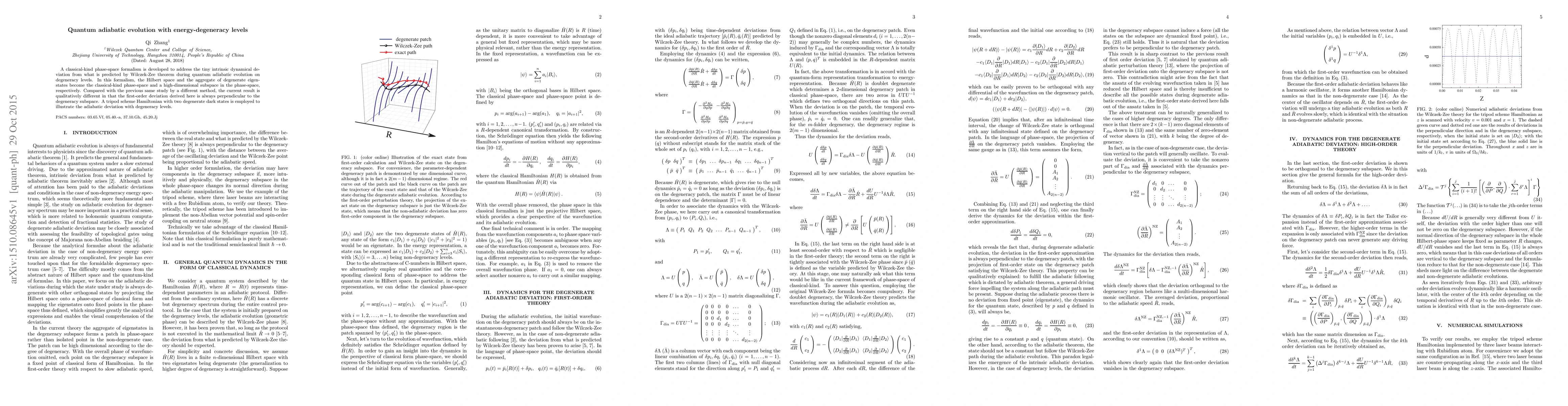 This paper develops a classical-phase space formalism to analyze the small dynamical deviations during quantum adiabatic evolution on energy-degeneracy levels, showing that the first-order deviation is perpendicular to the degeneracy subspace. A tripod scheme Hamiltonian is used to demonstrate these deviations.