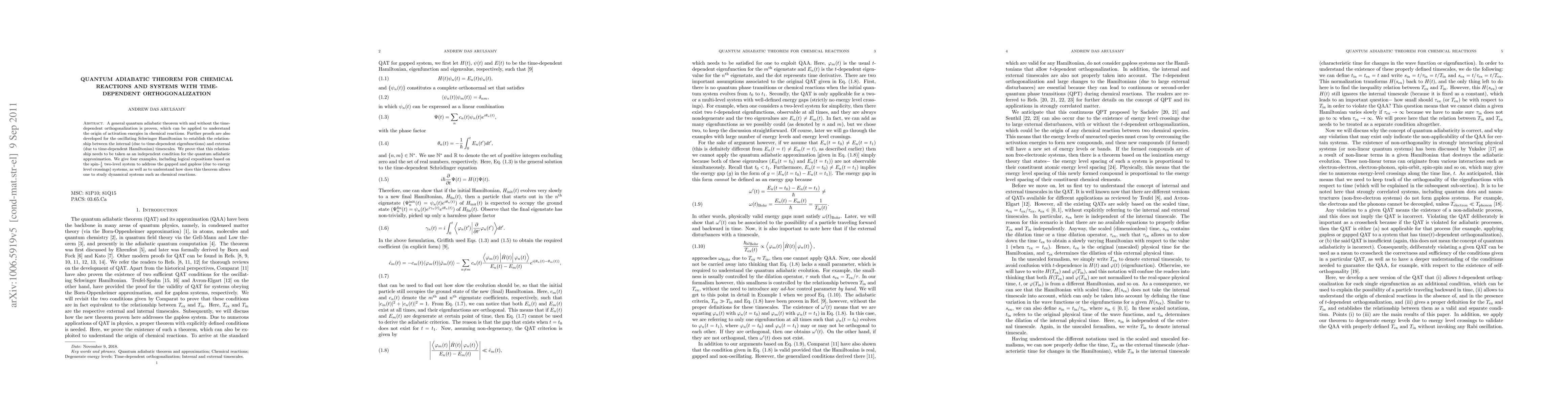This paper proves a general quantum adiabatic theorem applicable to chemical reactions, including systems with time-dependent orthogonalization. It establishes the relationship between internal and external time scales in such systems and provides four examples, including the spin-1/2 system, to illustrate the theorem's utility in understanding activation energies and dynamical systems.