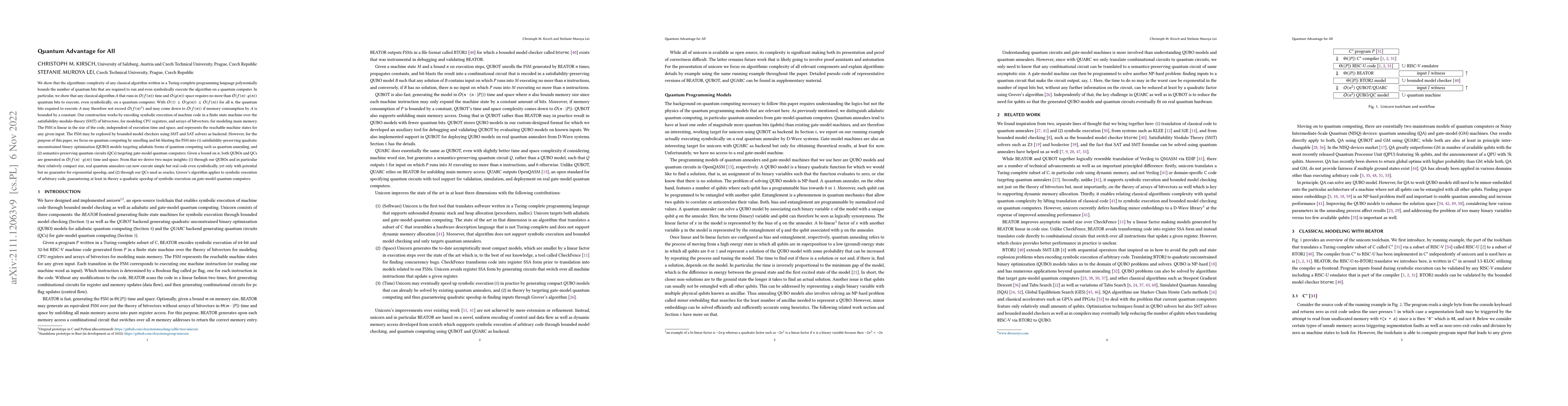 We show that the algorithmic complexity of any classical algorithm written in a Turing-complete programming language polynomially bounds the number of quantum bits that are required to run and even symbolically execute the algorithm on a quantum computer. In particular, we show that any classical algorithm $A$ that runs in $\mathcal{O}(f(n))$ time and $\mathcal{O}(g(n))$ space requires no more than $\mathcal{O}(f(n)\cdot g(n))$ quantum bits to execute, even symbolically, on a quantum computer. With $\mathcal{O}(1)\leq\mathcal{O}(g(n))\leq\mathcal{O}(f(n))$ for all $n$, the quantum bits required to execute $A$ may therefore not exceed $\mathcal{O}(f(n)^2)$ and may come down to $\mathcal{O}(f(n))$ if memory consumption by $A$ is bounded by a constant. Our construction works by encoding symbolic execution of machine code in a finite state machine over the satisfiability-modulo-theory (SMT) of bitvectors, for modeling CPU registers, and arrays of bitvectors, for modeling main memory. The FSM is linear in the size of the code, independent of execution time and space, and represents the reachable machine states for any given input. The FSM may be explored by bounded model checkers using SMT and SAT solvers as backend. However, for the purpose of this paper, we focus on quantum computing by unrolling and bit-blasting the FSM into (1)~satisfiability-preserving quadratic unconstrained binary optimization (QUBO) models targeting adiabatic forms of quantum computing such as quantum annealing, and (2)~semantics-preserving quantum circuits (QCs) targeting gate-model quantum computers. With our compact QUBOs, real quantum annealers can now execute simple but real code even symbolically, yet only with potential but no guarantee for exponential speedup, and with our QCs as oracles, Grover's algorithm applies to symbolic execution of arbitrary code, guaranteeing at least in theory a quadratic speedup.