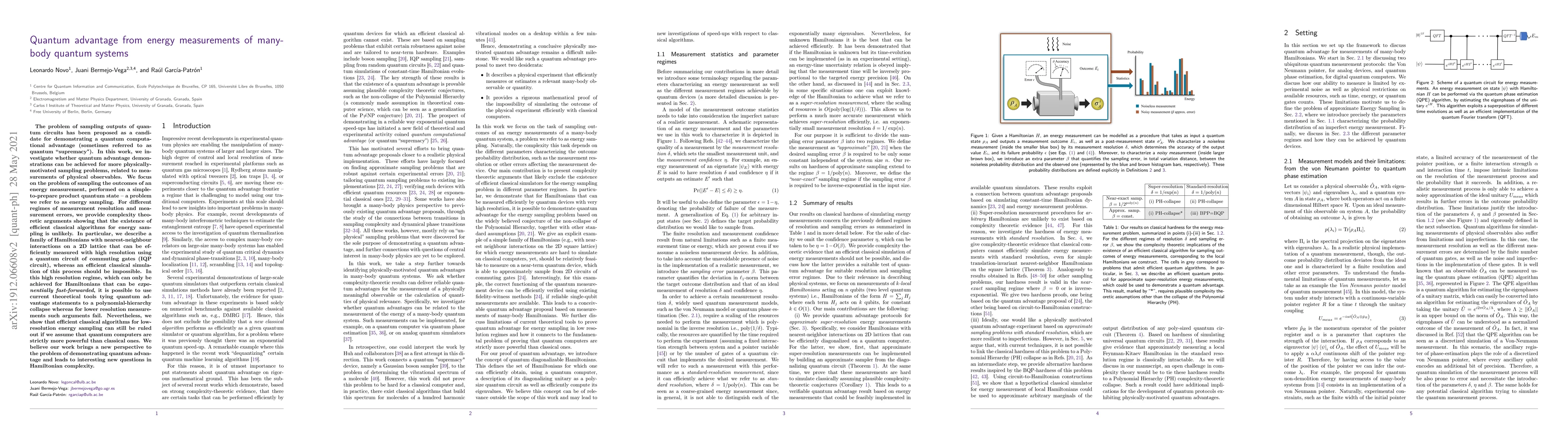This paper explores the potential for quantum advantage through energy sampling of many-body quantum systems, demonstrating that efficient classical algorithms for high-resolution energy sampling are unlikely. It identifies a class of Hamiltonians that can be efficiently measured on quantum circuits, suggesting a new approach to proving quantum supremacy.