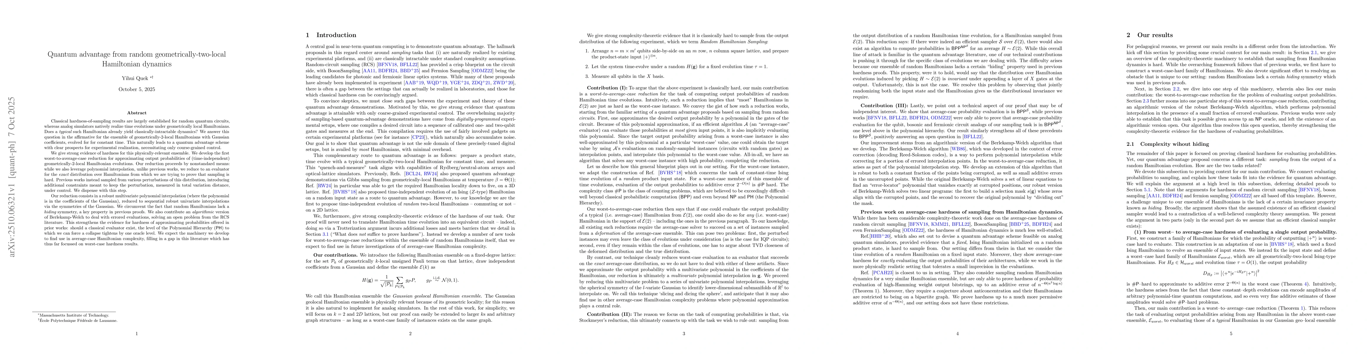 Classical hardness-of-sampling results are largely established for random quantum circuits, whereas analog simulators natively realize time evolutions under geometrically local Hamiltonians. Does a typical such Hamiltonian already yield classically-intractable dynamics? We answer this question in the affirmative for the ensemble of geometrically-2-local Hamiltonians with Gaussian coefficients, evolved for constant time. This naturally leads to a quantum advantage scheme with clear prospects for experimental realization, necessitating only course-grained control. We give strong evidence of hardness for this physically-relevant ensemble. We develop the first worst-to-average-case reduction for approximating output probabilities of (time-independent) geometrically-2-local Hamiltonian evolutions. Our reduction proceeds by nonstandard means: while we also leverage polynomial interpolation, unlike previous works, we reduce directly to an evaluator for the exact distribution over Hamiltonians, from which we are trying to prove that sampling is hard. Previous works instead sampled from various perturbations of the true distribution, introducing additional constraints meant to keep the perturbation, measured in total variation distance, under control. We dispense with this step. Our reduction consists in a robust multivariate polynomial interpolation, reduced to sequential robust univariate interpolations via the symmetries of the Gaussian. We circumvent the fact that random Hamiltonians lack a hiding symmetry, a key property in previous proofs. We also contribute an algorithmic version of Berlekamp-Welch to deal with errored evaluations, solving an open problem from the RCS literature. We expect the machinery we develop to find use in average-case Hamiltonian complexity, filling in a gap in this literature which has thus far focussed on worst-case hardness results.
