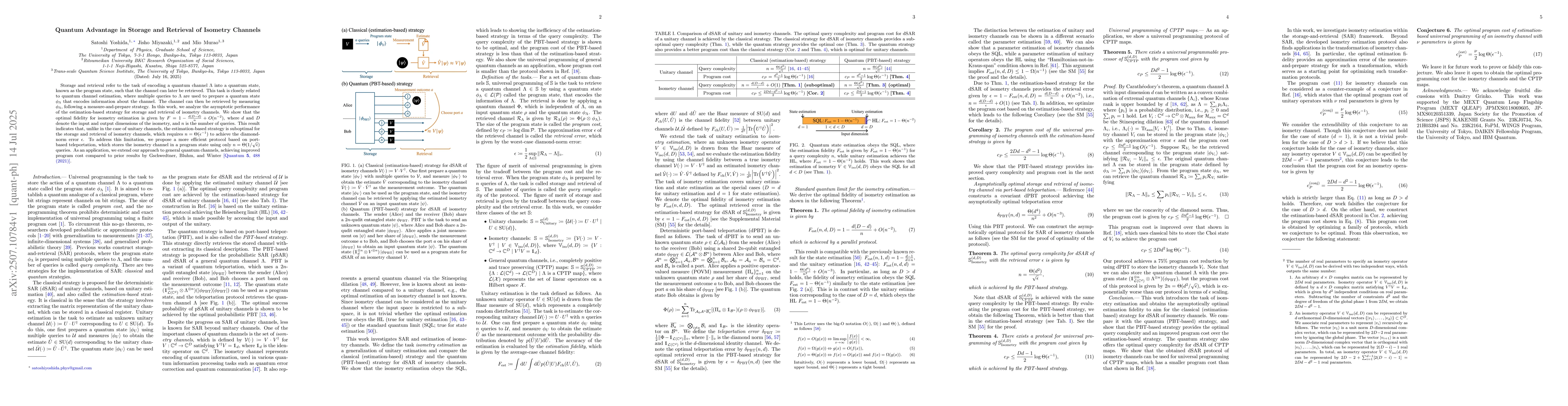 Storage and retrieval refer to the task of encoding a quantum channel $\Lambda$ into a quantum state, known as the program state, such that the channel can later be retrieved. This task is closely related to quantum channel estimation, where multiple queries to $\Lambda$ are used to prepare a quantum state $\phi_\Lambda$ that encodes information about the channel. The channel can then be retrieved by measuring $\phi_\Lambda$, following a measure-and-prepare strategy. In this work, we analyze the asymptotic performance of the estimation-based strategy for storage and retrieval of isometry channels. We show that the optimal fidelity for isometry estimation is given by $F = 1-{d(D-d)\over n} + O(n^{-2})$, where $d$ and $D$ denote the input and output dimensions of the isometry, and $n$ is the number of queries. This result indicates that, unlike in the case of unitary channels, the estimation-based strategy is suboptimal for the storage and retrieval of isometry channels, which requires $n = \Theta(\epsilon^{-1})$ to achieve the diamond-norm error $\epsilon$. To address this limitation, we propose a more efficient protocol based on port-based teleportation, which stores the isometry channel in a program state using only $n = \Theta(1/\sqrt{\epsilon})$ queries. As an application, we extend our approach to general quantum channels, achieving improved program cost compared to prior results by Gschwedtner, Bluhm, and Winter [Quantum $\textbf{5}$, 488 (2021)].