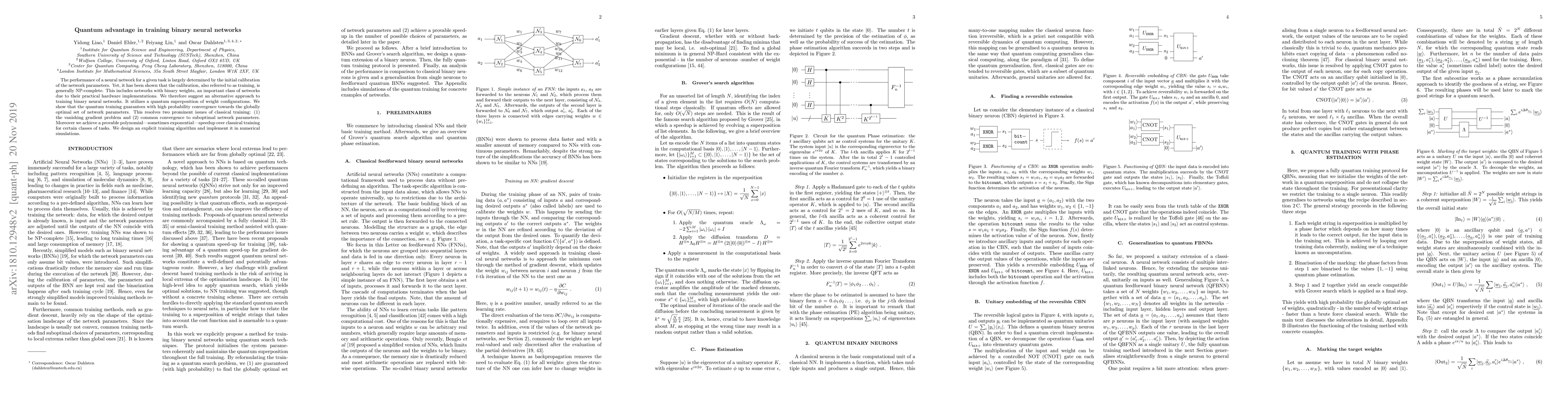 The performance of a neural network for a given task is largely determined by the initial calibration of the network parameters. Yet, it has been shown that the calibration, also referred to as training, is generally NP-complete. This includes networks with binary weights, an important class of networks due to their practical hardware implementations. We therefore suggest an alternative approach to training binary neural networks. It utilizes a quantum superposition of weight configurations. We show that the quantum training guarantees with high probability convergence towards the globally optimal set of network parameters. This resolves two prominent issues of classical training: (1) the vanishing gradient problem and (2) common convergence to suboptimal network parameters. Moreover we achieve a provable polynomial---sometimes exponential---speedup over classical training for certain classes of tasks. We design an explicit training algorithm and implement it in numerical simulations.