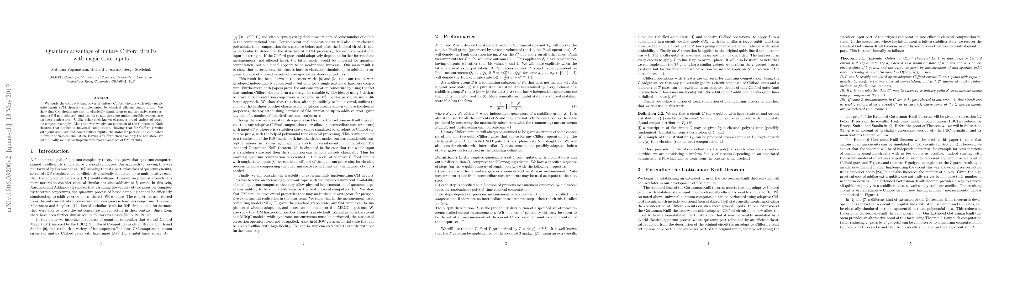 This paper demonstrates that unitary Clifford circuits with magic state inputs (CM circuits) offer quantum computational advantages, proving they are hard to simulate classically under certain conditions. It also extends the Gottesman-Knill theorem for universal computation and discusses practical implementation benefits of CM circuits.