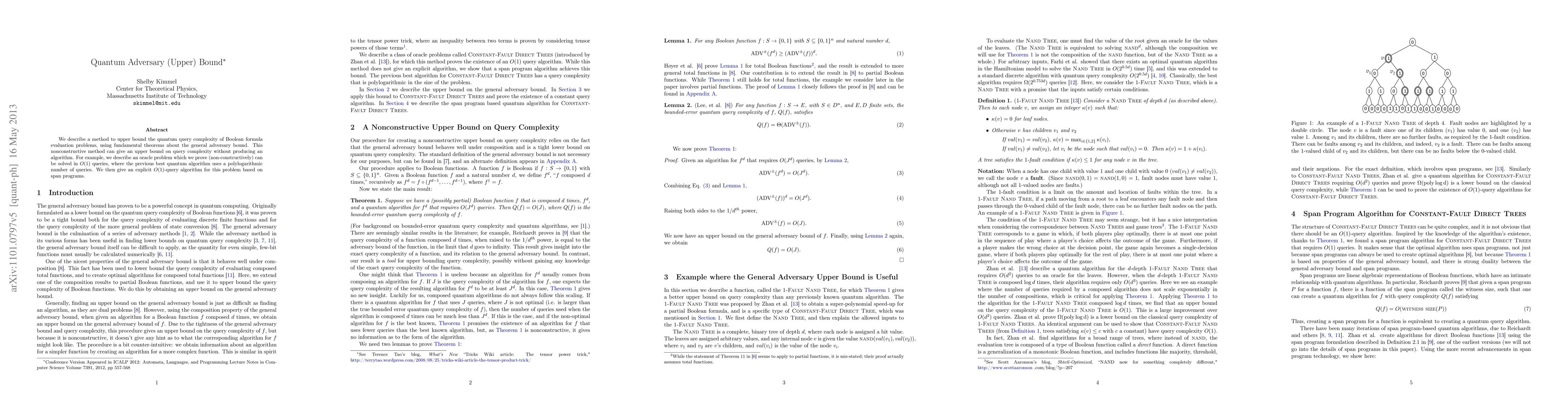 This paper introduces a nonconstructive method for upper bounding the quantum query complexity of Boolean formula evaluation, leveraging the general adversary bound. It demonstrates an oracle problem that can be solved in $O(1)$ queries, improving upon a previous polylogarithmic quantum algorithm, and provides an explicit $O(1)$-query algorithm using span programs.