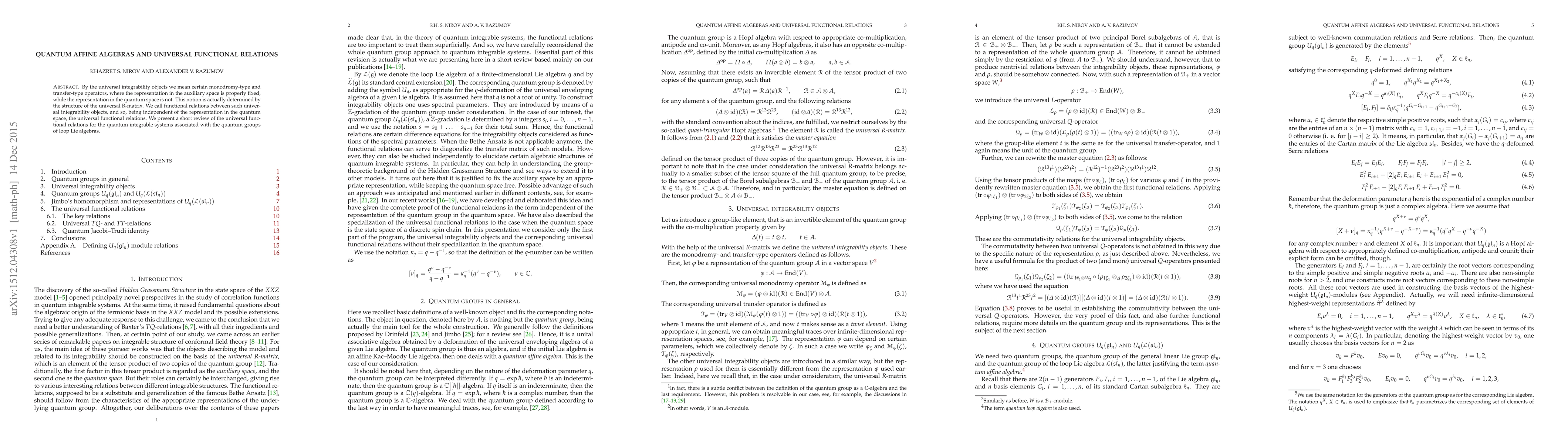 This paper reviews universal functional relations in quantum integrable systems linked to quantum groups of loop Lie algebras, focusing on monodromy-type and transfer-type operators defined by the universal R-matrix. These relations are independent of the specific representation in the quantum space.