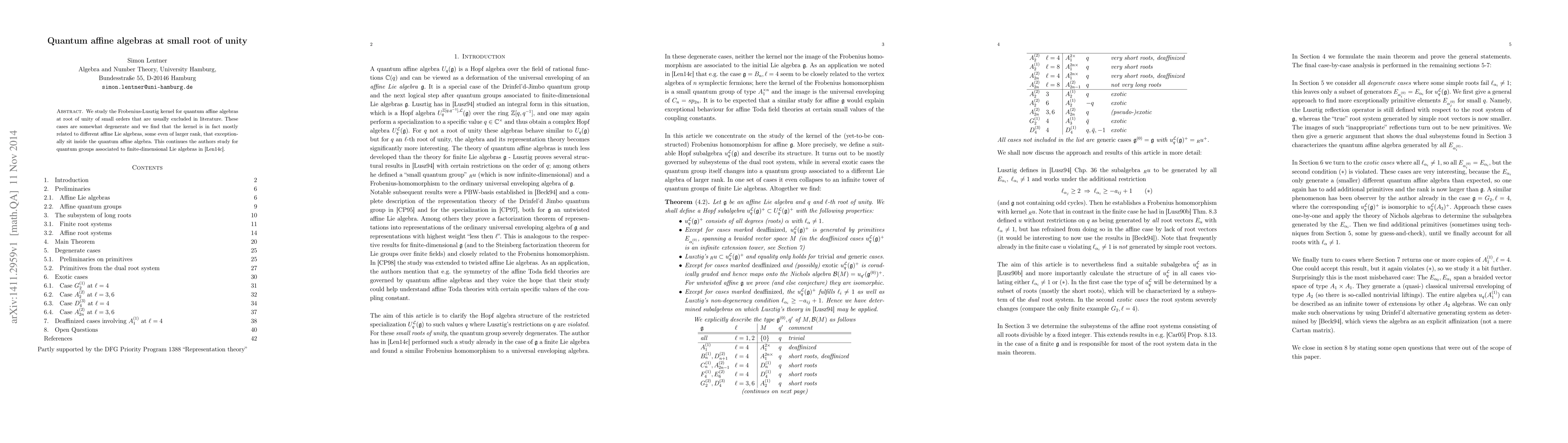 This paper investigates the Frobenius-Lusztig kernel for quantum affine algebras at small excluded roots of unity, revealing that these degenerate cases are linked to different affine Lie algebras, sometimes of higher rank, embedded within the quantum affine algebra. This extends previous research on quantum groups related to finite-dimensional Lie algebras.