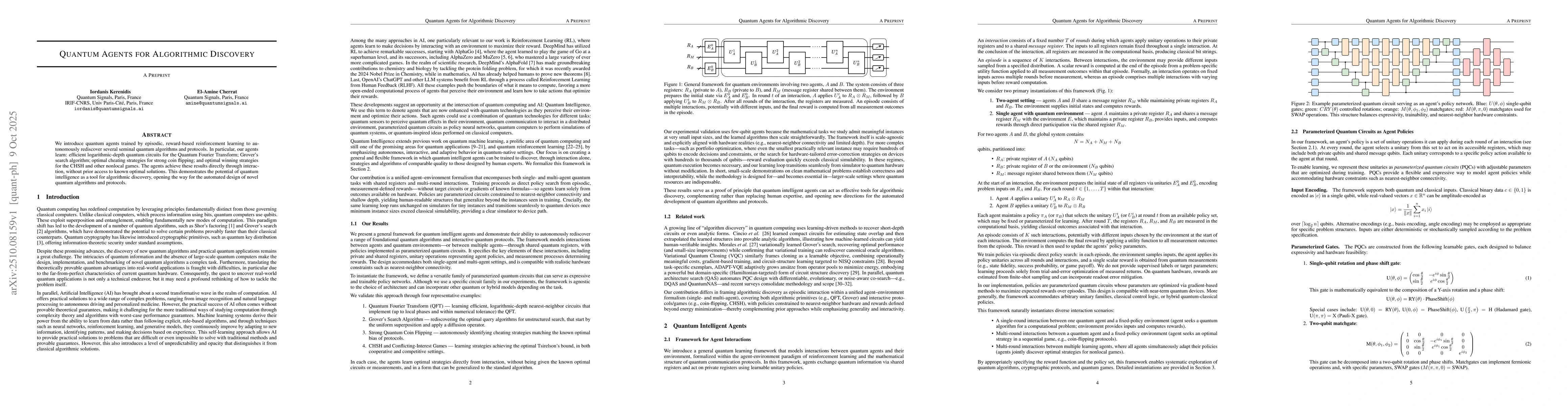 We introduce quantum agents trained by episodic, reward-based reinforcement learning to autonomously rediscover several seminal quantum algorithms and protocols. In particular, our agents learn: efficient logarithmic-depth quantum circuits for the Quantum Fourier Transform; Grover's search algorithm; optimal cheating strategies for strong coin flipping; and optimal winning strategies for the CHSH and other nonlocal games. The agents achieve these results directly through interaction, without prior access to known optimal solutions. This demonstrates the potential of quantum intelligence as a tool for algorithmic discovery, opening the way for the automated design of novel quantum algorithms and protocols.