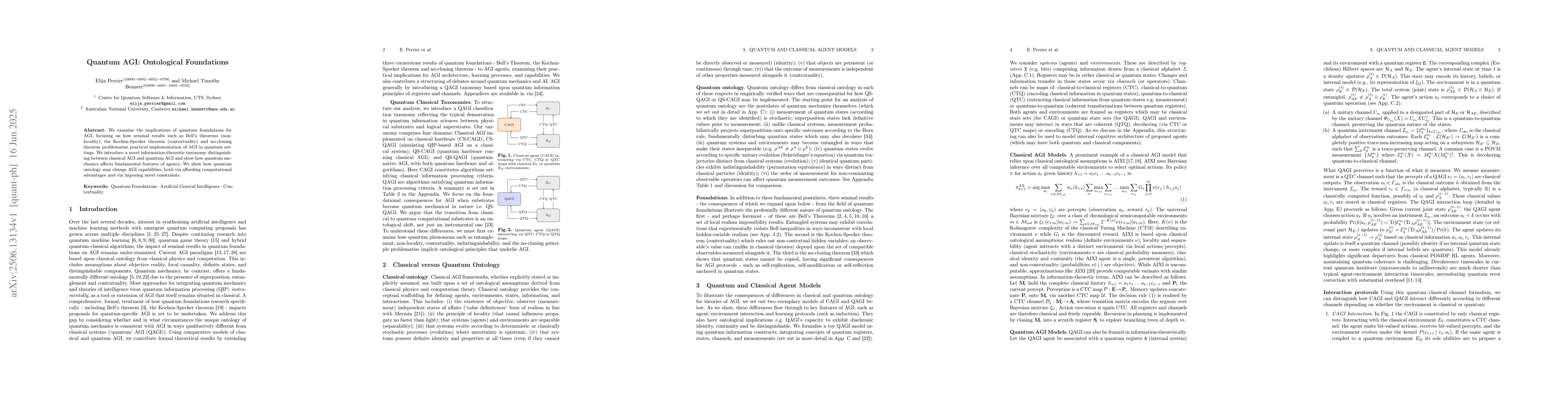 We examine the implications of quantum foundations for AGI, focusing on how seminal results such as Bell's theorems (non-locality), the Kochen-Specker theorem (contextuality) and no-cloning theorem problematise practical implementation of AGI in quantum settings. We introduce a novel information-theoretic taxonomy distinguishing between classical AGI and quantum AGI and show how quantum mechanics affects fundamental features of agency. We show how quantum ontology may change AGI capabilities, both via affording computational advantages and via imposing novel constraints.