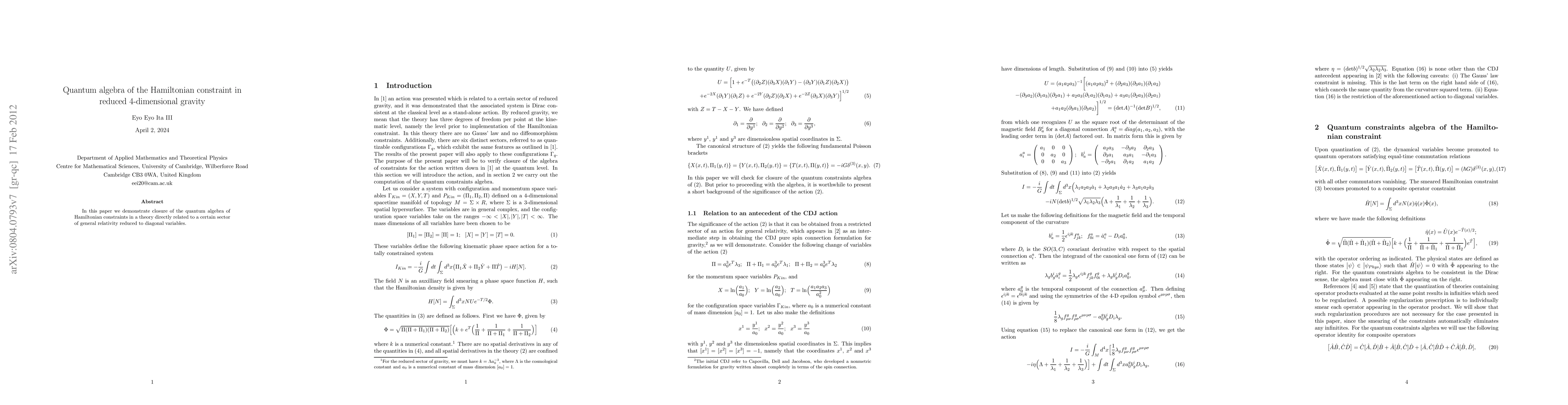 Summary: This paper shows that the quantum algebra of Hamiltonian constraints closes in a reduced four-dimensional gravity theory, directly linked to a specific sector of simplified general relativity. The closure indicates a consistent quantum framework for this gravitational model.