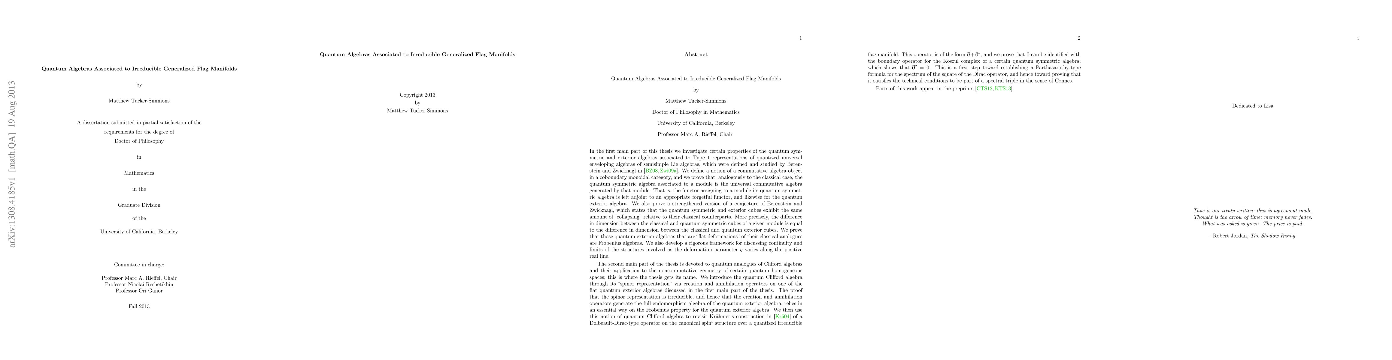 The first part of this thesis deals with certain properties of the quantum symmetric and exterior algebras of Type 1 representations of $U_q(g)$ defined by Berenstein and Zwicknagl. We define a notion of a commutative algebra object in a coboundary category, and we prove that the quantum symmetric algebra of a module is the universal commutative algebra generated by that module. That is, the functor assigning to a module its quantum symmetric algebra is left adjoint to a forgetful functor. We also prove a conjecture of Berenstein and Zwicknagl, stating that the quantum symmetric and exterior cubes exhibit the same amount of "collapsing" relative to their classical counterparts. We prove that those quantum exterior algebras that are flat deformations of their classical analogues are Frobenius algebras. We also develop a rigorous framework for discussing continuity and limits of the structures involved as the deformation parameter q varies along the positive real line. The second part deals with quantum analogues of Clifford algebras and their application to the noncommutative geometry of certain quantum homogeneous spaces. We introduce the quantum Clifford algebra through its spinor representation via creation and annihilation operators on one of the flat quantum exterior algebras discussed in the first part. The proof that the spinor representation is irreducible relies on the Frobenius property discussed previously. We use this quantum Clifford algebra to revisit Krahmer's construction of a Dolbeault-Dirac-type operator on a quantized irreducible flag manifold. This operator is of the form $d+d^*$, and we relate $d$ to the boundary operator for the Koszul complex of a certain quantum symmetric algebra, which shows that $d^2=0$. This is a first step toward a Parthasarathy-type formula for the spectrum of the square of the Dirac operator.