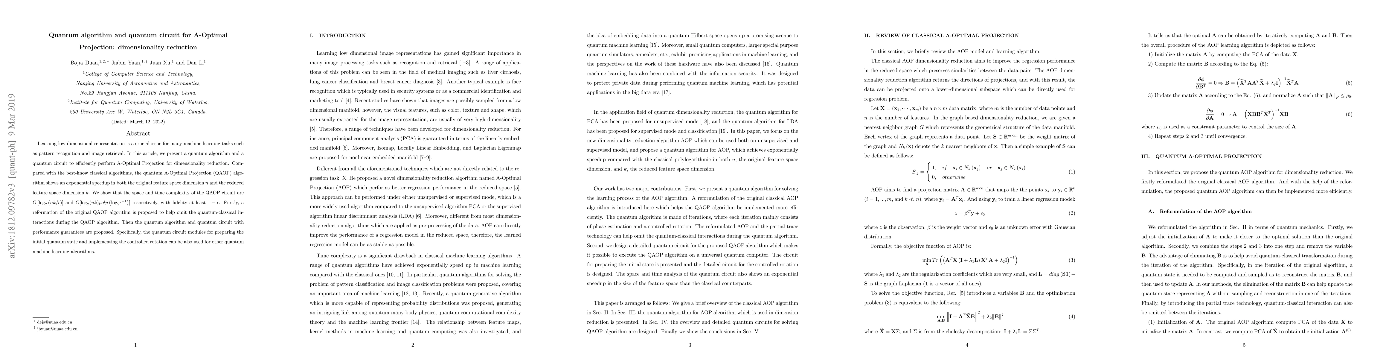 Summary: This paper introduces a quantum algorithm and circuit for A-Optimal Projection, achieving exponential speedup over classical methods for dimensionality reduction in machine learning tasks. The quantum approach offers improved space and time complexities, with modular quantum circuit components beneficial for various quantum machine learning applications.