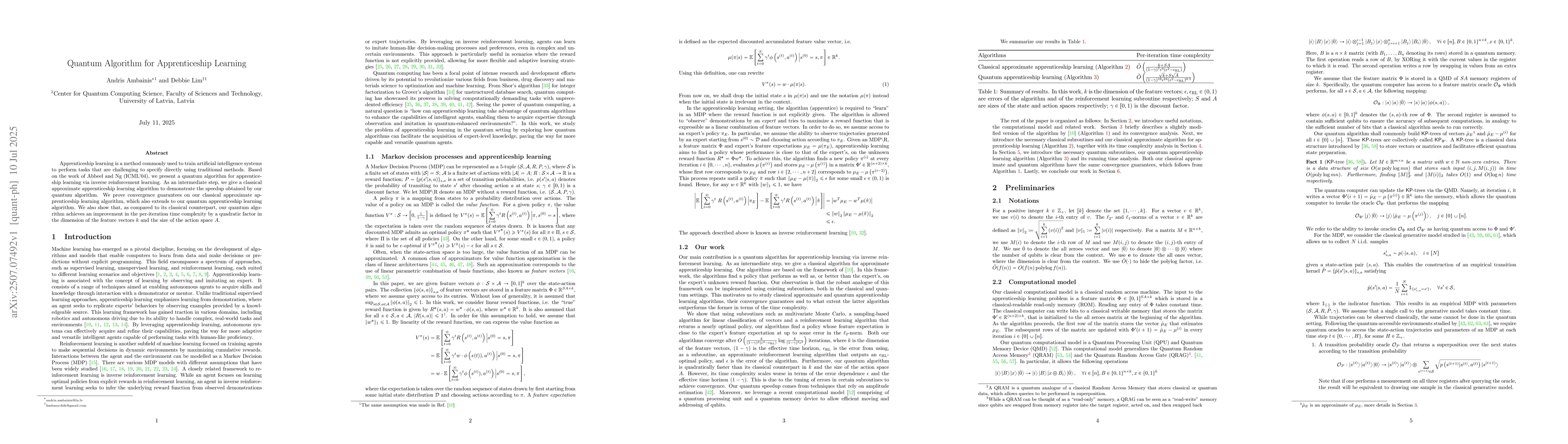Apprenticeship learning is a method commonly used to train artificial intelligence systems to perform tasks that are challenging to specify directly using traditional methods. Based on the work of Abbeel and Ng (ICML'04), we present a quantum algorithm for apprenticeship learning via inverse reinforcement learning. As an intermediate step, we give a classical approximate apprenticeship learning algorithm to demonstrate the speedup obtained by our quantum algorithm. We prove convergence guarantees on our classical approximate apprenticeship learning algorithm, which also extends to our quantum apprenticeship learning algorithm. We also show that, as compared to its classical counterpart, our quantum algorithm achieves an improvement in the per-iteration time complexity by a quadratic factor in the dimension of the feature vectors $k$ and the size of the action space $A$.