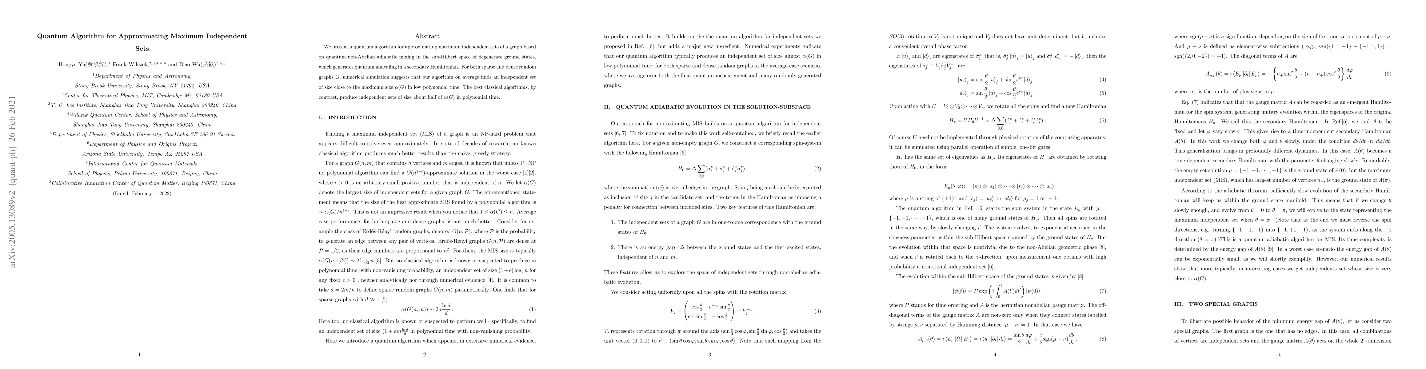 This paper introduces a quantum algorithm leveraging quantum non-Abelian adiabatic mixing to approximate maximum independent sets in graphs, achieving an average size close to $\alpha(G)$. The proposed $O(n^2)$ time complexity quantum method outperforms classical algorithms, which can only find sets of size about half of $\alpha(G)$.