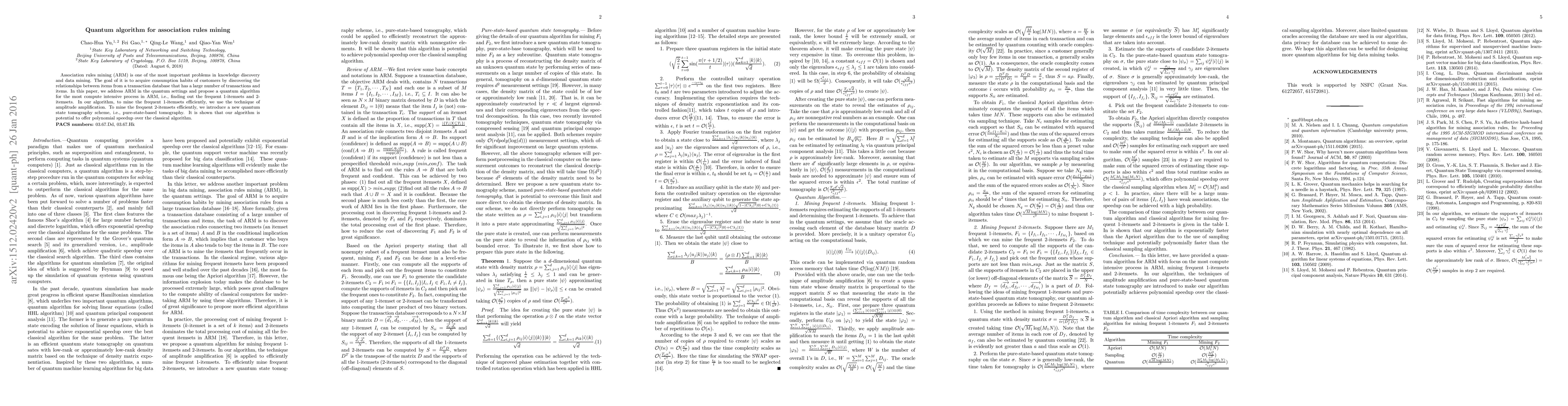 Association rules mining is one of the most important problems in knowledge discovery and data mining. The goal of it is to acquire consumption habits of customers by discovering the relationships between items from a transaction database that has a large number of transactions and items. The most compute intensive process for ARM is to find out the frequent 1-itemsets and 2-itemsets. In this paper, we propose a quantum algorithm for finding out the frequent 1-itemsets and 2-itemsets. In our algorithm, to mine the frequent 1-itemsets efficiently, we use the technique of amplitude amplification. To mine the frequent 2-itemsets efficiently, we propose a new tomography scheme, i.e., pure-state-based quantum state tomography. It is shown that our algorithm is potential to achieve exponential speedup in the number of transactions and polynomial speedup in the number of items over the classical algorithm.