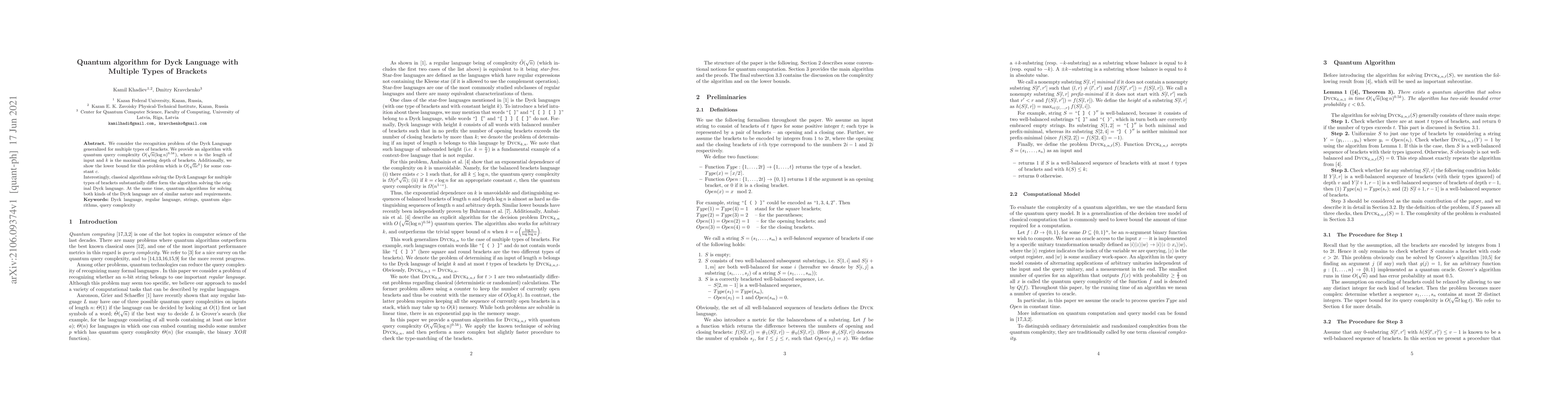 Researchers developed a quantum algorithm to solve the Dyck Language problem with multiple types of brackets, achieving O(sqrt(n)(log n)^0.5k) query complexity, while also establishing a lower bound of O(sqrt(n)c^k).
