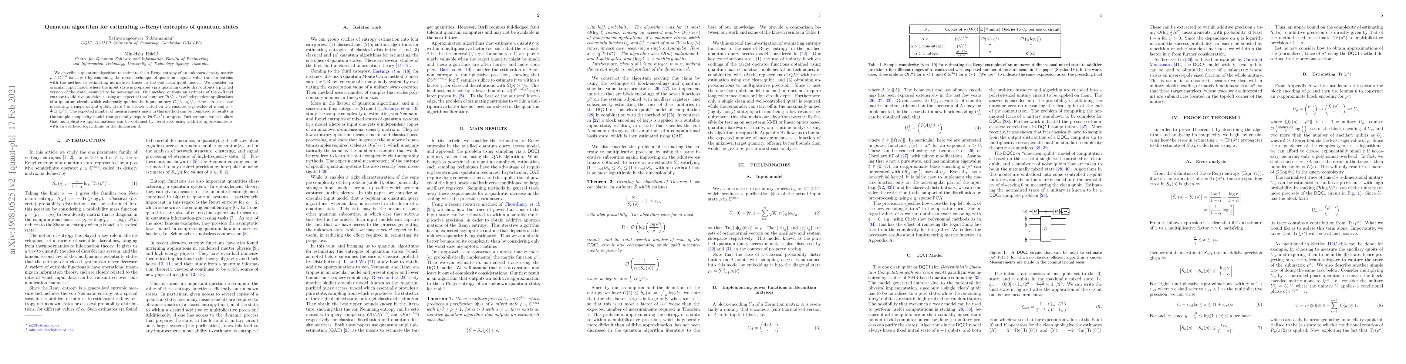 A quantum algorithm estimates Renyi entropies of unknown quantum states with additive precision using a combination of quantum singular value transformations and normalised trace estimation, achieving a lower sample complexity than traditional methods.