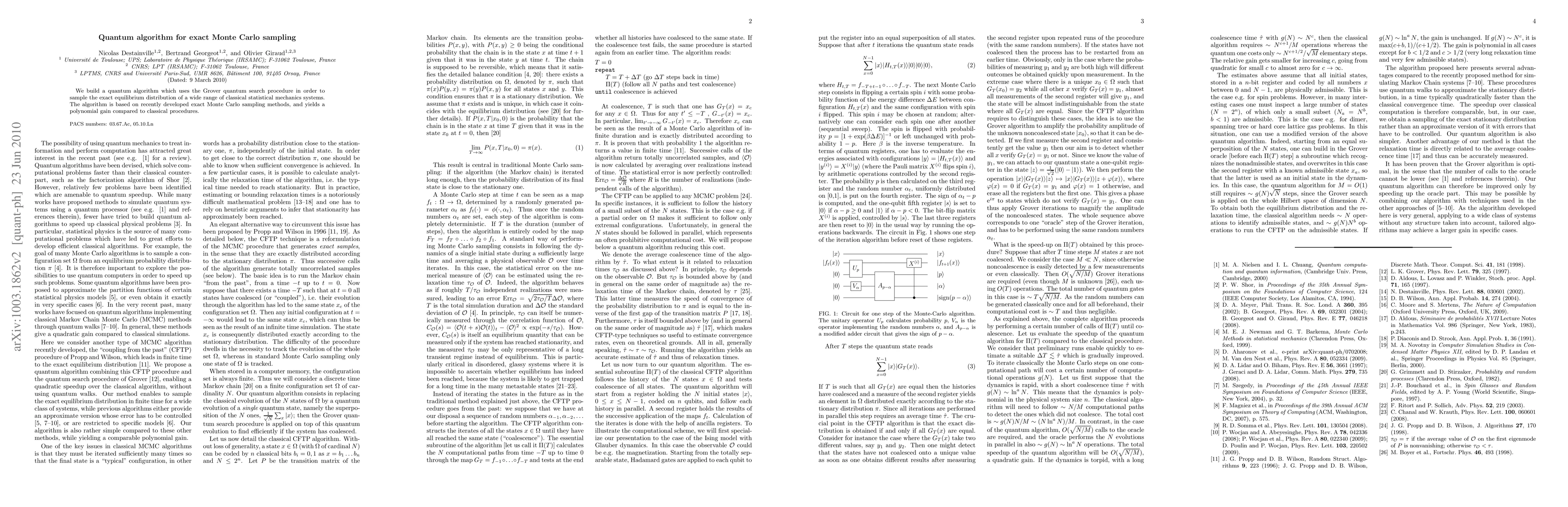 Summary: This paper proposes a quantum algorithm leveraging Grover's search to achieve exact Monte Carlo sampling for statistical mechanics systems, offering a polynomial speedup over classical methods. The approach combines quantum mechanics with advanced Monte Carlo techniques for improved efficiency.