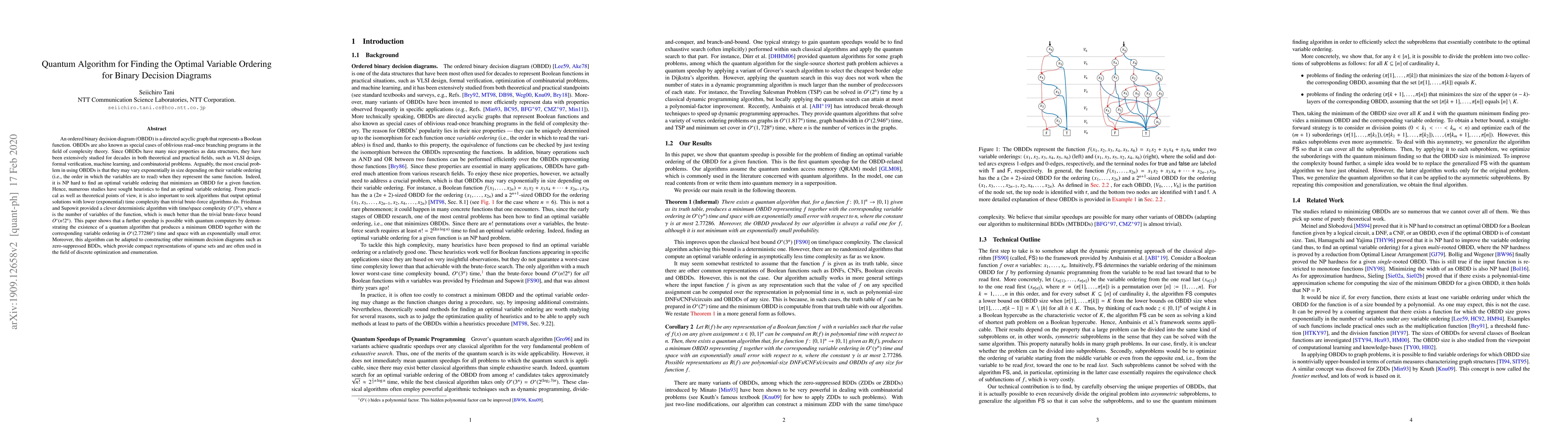 An ordered binary decision diagram (OBDD) is a directed acyclic graph that represents a Boolean function. OBDDs are also known as special cases of oblivious read-once branching programs in the field of complexity theory. Since OBDDs have many nice properties as data structures, they have been extensively studied for decades in both theoretical and practical fields, such as VLSI design, formal verification, machine learning, and combinatorial problems. Arguably, the most crucial problem in using OBDDs is that they may vary exponentially in size depending on their variable ordering (i.e., the order in which the variable are to read) when they represent the same function. Indeed, it is NP hard to find an optimal variable ordering that minimizes an OBDD for a given function. Hence, numerous studies have sought heuristics to find an optimal variable ordering. From practical as well as theoretical points of view, it is also important to seek algorithms that output optimal solutions with lower (exponential) time complexity than trivial brute-force algorithms do. Friedman and Supowit provided a clever deterministic algorithm with time/space complexity $O^\ast(3^n)$, where $n$ is the number of variables of the function, which is much better than the trivial brute-force bound $O^\ast(n!2^n)$. This paper shows that a further speedup is possible with quantum computers by demonstrating the existence of a quantum algorithm that produces a minimum OBDD together with the corresponding variable ordering in $O^\ast(2.77286^n)$ time and space with an exponentially small error. Moreover, this algorithm can be adapted to constructing other minimum decision diagrams such as zero-suppressed BDDs, which provide compact representations of sparse sets and are often used in the field of discrete optimization and enumeration.