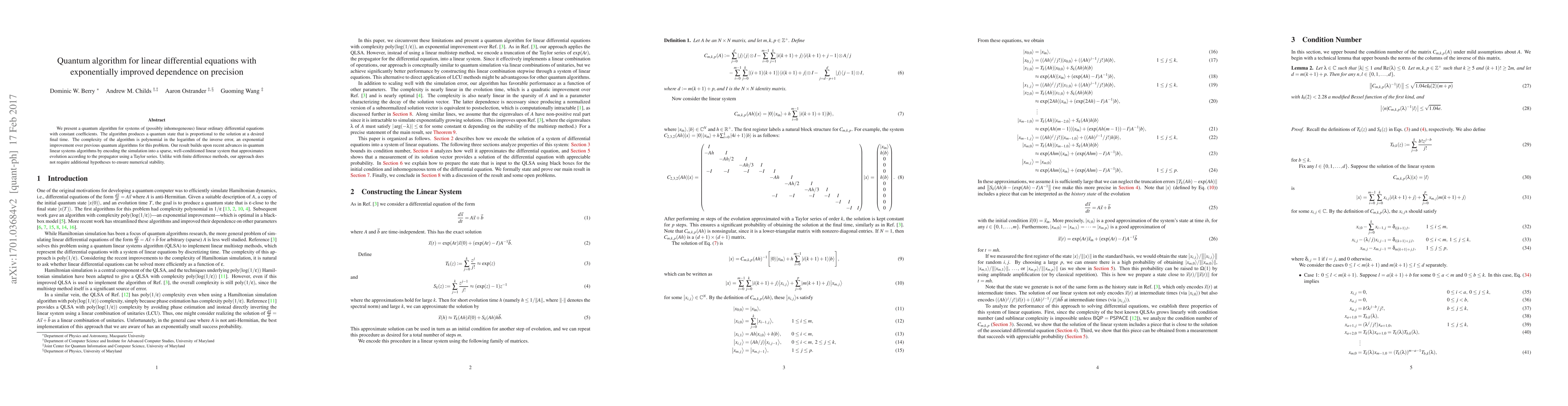 This paper introduces a quantum algorithm that solves linear ordinary differential equations with constant coefficients, achieving polynomial complexity in the logarithm of the inverse error, thus exponentially improving upon previous quantum methods. The algorithm encodes the differential equation simulation into a sparse, well-conditioned linear system, ensuring numerical stability without additional hypotheses.