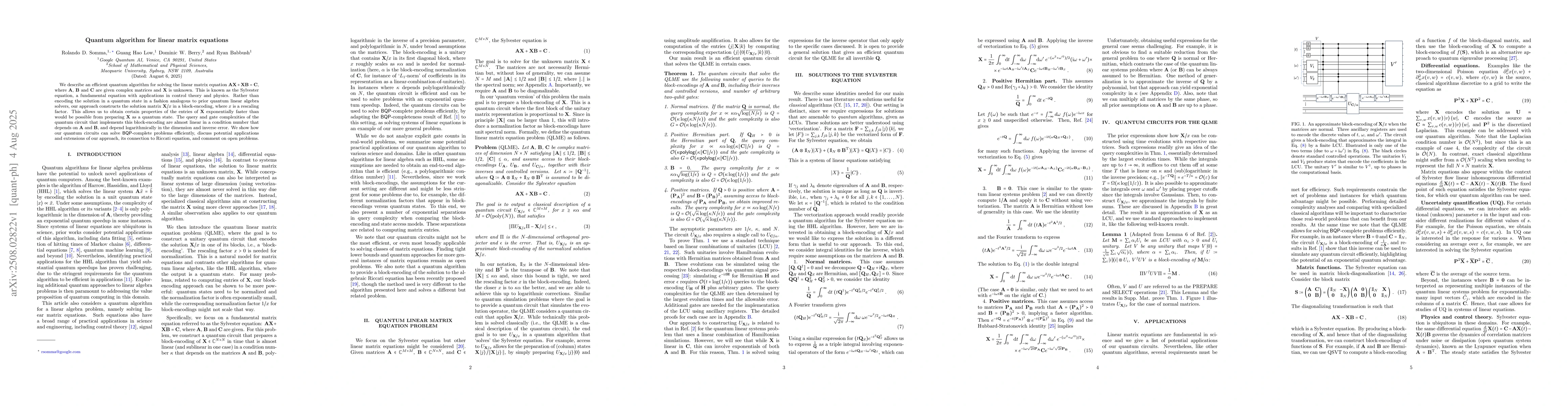 We describe an efficient quantum algorithm for solving the linear matrix equation AX+XB=C, where A, B and C are given complex matrices and X is unknown. This is known as the Sylvester equation, a fundamental equation with applications in control theory and physics. Rather than encoding the solution in a quantum state in a fashion analogous to prior quantum linear algebra solvers, our approach constructs the solution matrix X in a block-encoding, rescaled by some factor. This allows us to obtain certain properties of the entries of X exponentially faster than would be possible from preparing X as a quantum state. The query and gate complexities of the quantum circuit that implements this block-encoding are almost linear in a condition number that depends on A and B, and depend logarithmically in the dimension and inverse error. We show how our quantum circuits can solve BQP-complete problems efficiently, discuss potential applications and extensions of our approach, its connection to Riccati equation, and comment on open problems.