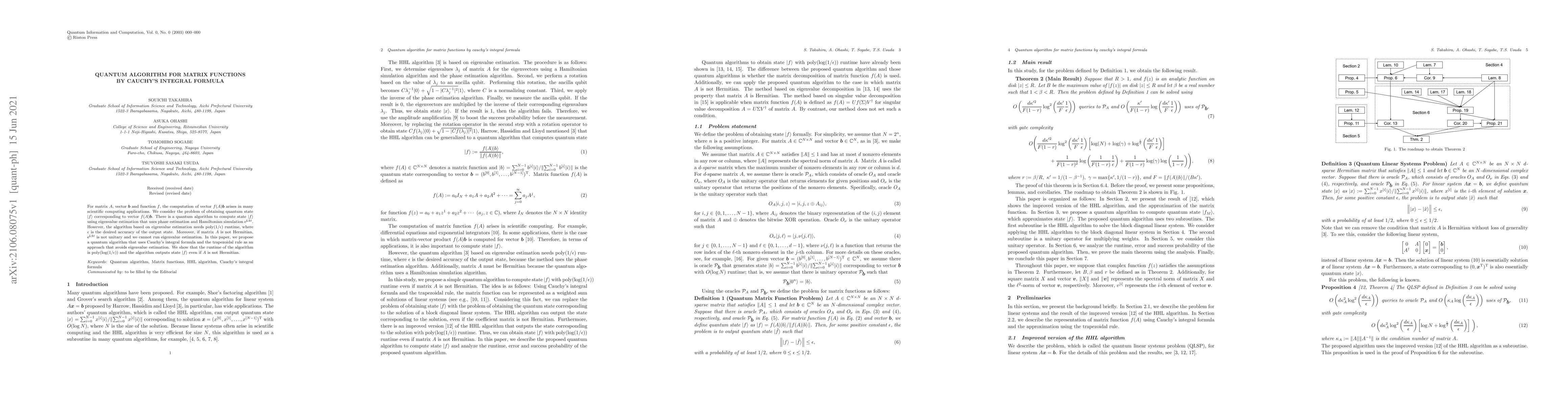 For matrix $A$, vector $\boldsymbol{b}$ and function $f$, the computation of vector $f(A)\boldsymbol{b}$ arises in many scientific computing applications. We consider the problem of obtaining quantum state $\lvert f \rangle$ corresponding to vector $f(A)\boldsymbol{b}$. There is a quantum algorithm to compute state $\lvert f \rangle$ using eigenvalue estimation that uses phase estimation and Hamiltonian simulation $\mathrm{e}^{\mathrm{{\bf i}} A t}$. However, the algorithm based on eigenvalue estimation needs $\textrm{poly}(1/\epsilon)$ runtime, where $\epsilon$ is the desired accuracy of the output state. Moreover, if matrix $A$ is not Hermitian, $\mathrm{e}^{\mathrm{{\bf i}} A t}$ is not unitary and we cannot run eigenvalue estimation. In this paper, we propose a quantum algorithm that uses Cauchy's integral formula and the trapezoidal rule as an approach that avoids eigenvalue estimation. We show that the runtime of the algorithm is $\mathrm{poly}(\log(1/\epsilon))$ and the algorithm outputs state $\lvert f \rangle$ even if $A$ is not Hermitian.