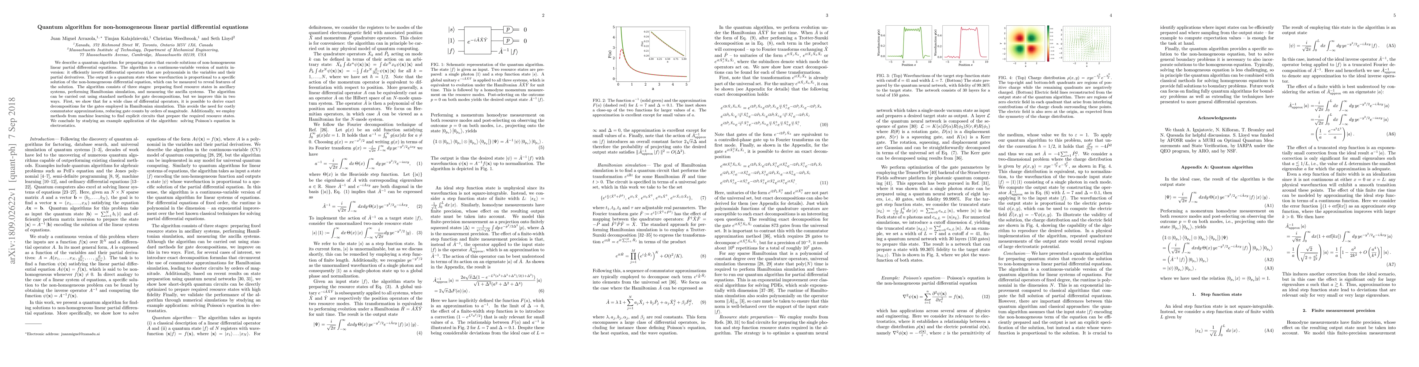 We describe a quantum algorithm for preparing states that encode solutions of non-homogeneous linear partial differential equations. The algorithm is a continuous-variable version of matrix inversion: it efficiently inverts differential operators that are polynomials in the variables and their partial derivatives. The output is a quantum state whose wavefunction is proportional to a specific solution of the non-homogeneous differential equation, which can be measured to reveal features of the solution. The algorithm consists of three stages: preparing fixed resource states in ancillary systems, performing Hamiltonian simulation, and measuring the ancilla systems. The algorithm can be carried out using standard methods for gate decompositions, but we improve this in two ways. First, we show that for a wide class of differential operators, it is possible to derive exact decompositions for the gates employed in Hamiltonian simulation. This avoids the need for costly commutator approximations, reducing gate counts by orders of magnitude. Additionally, we employ methods from machine learning to find explicit circuits that prepare the required resource states. We conclude by studying an example application of the algorithm: solving Poisson's equation in electrostatics.