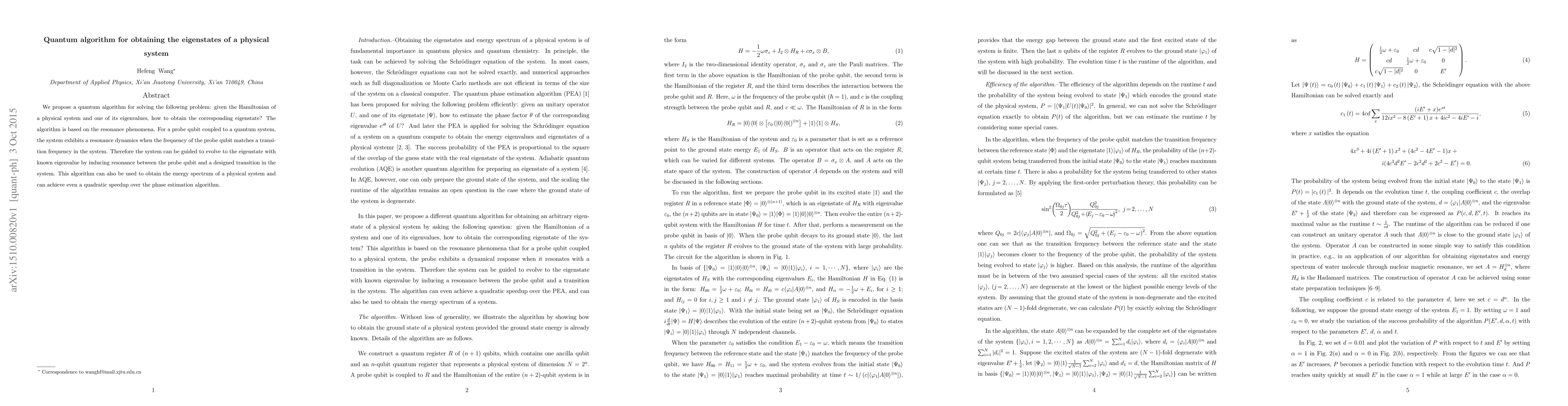 We propose a quantum algorithm for solving the following problem: given the Hamiltonian of a physical system and one of its eigenvalues, how to obtain the corresponding eigenstate? The algorithm is based on the resonance phenomena. For a probe qubit coupled to a quantum system, the system exhibits a resonance dynamics when the frequency of the probe qubit matches a transition frequency in the system. Therefore the system can be guided to evolve to the eigenstate with known eigenvalue by inducing resonance between the probe qubit and a designed transition in the system. This algorithm can also be used to obtain the energy spectrum of a physical system and can achieve even a quadratic speedup over the phase estimation algorithm.