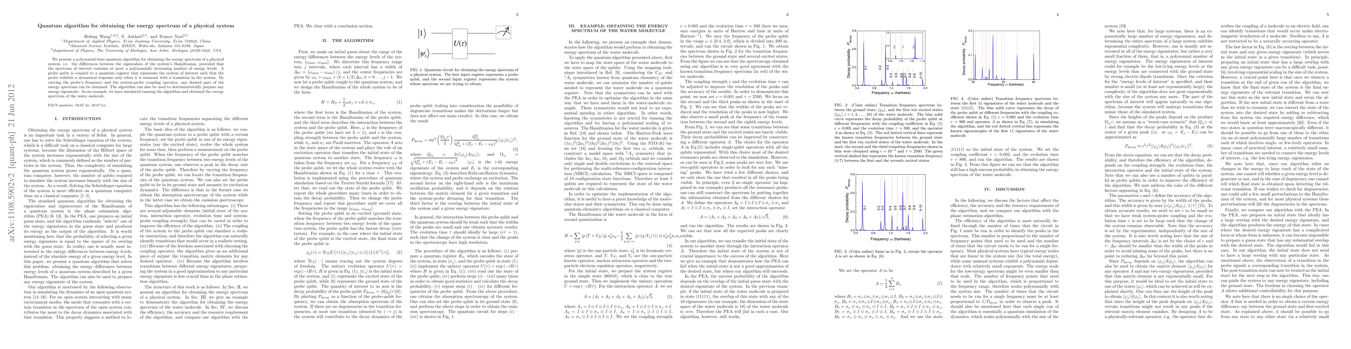 We present a polynomial-time quantum algorithm for obtaining the energy spectrum of a physical system, i.e. the differences between the eigenvalues of the system's Hamiltonian, provided that the spectrum of interest contains at most a polynomially increasing number of energy levels. A probe qubit is coupled to a quantum register that represents the system of interest such that the probe exhibits a dynamical response only when it is resonant with a transition in the system. By varying the probe's frequency and the system-probe coupling operator, any desired part of the energy spectrum can be obtained. The algorithm can also be used to deterministically prepare any energy eigenstate. As an example, we have simulated running the algorithm and obtained the energy spectrum of the water molecule.