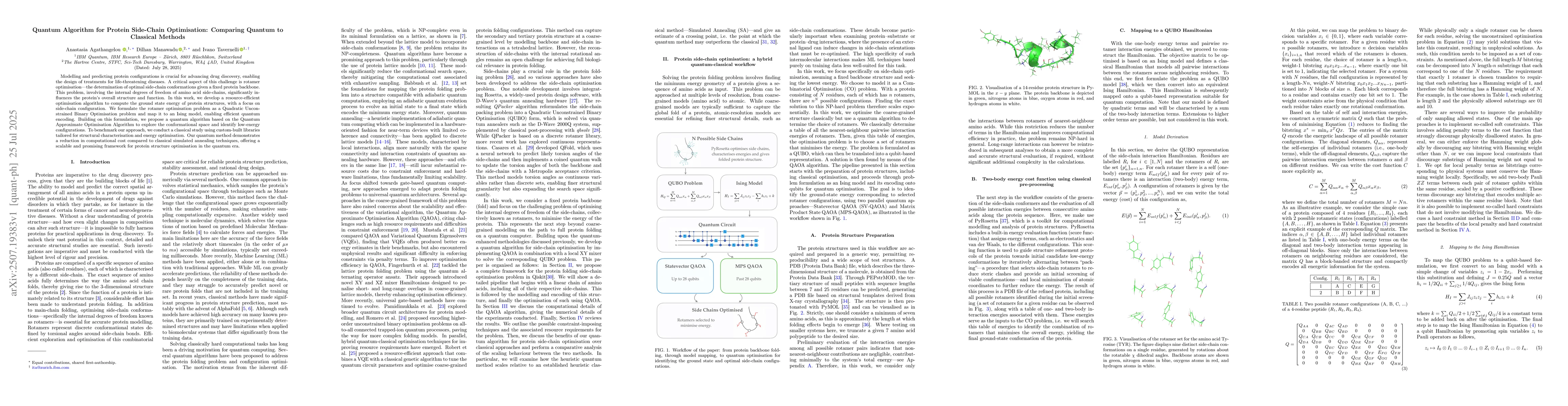 Modelling and predicting protein configurations is crucial for advancing drug discovery, enabling the design of treatments for life-threatening diseases. A critical aspect of this challenge is rotamer optimisation - the determination of optimal side-chain conformations given a fixed protein backbone. This problem, involving the internal degrees of freedom of amino acid side-chains, significantly influences the protein's overall structure and function. In this work, we develop a resource-efficient optimisation algorithm to compute the ground state energy of protein structures, with a focus on side-chain configuration. We formulate the rotamer optimisation problem as a Quadratic Unconstrained Binary Optimisation problem and map it to an Ising model, enabling efficient quantum encoding. Building on this formulation, we propose a quantum algorithm based on the Quantum Approximate Optimisation Algorithm to explore the conformational space and identify low-energy configurations. To benchmark our approach, we conduct a classical study using custom-built libraries tailored for structural characterisation and energy optimisation. Our quantum method demonstrates a reduction in computational cost compared to classical simulated annealing techniques, offering a scalable and promising framework for protein structure optimisation in the quantum era.