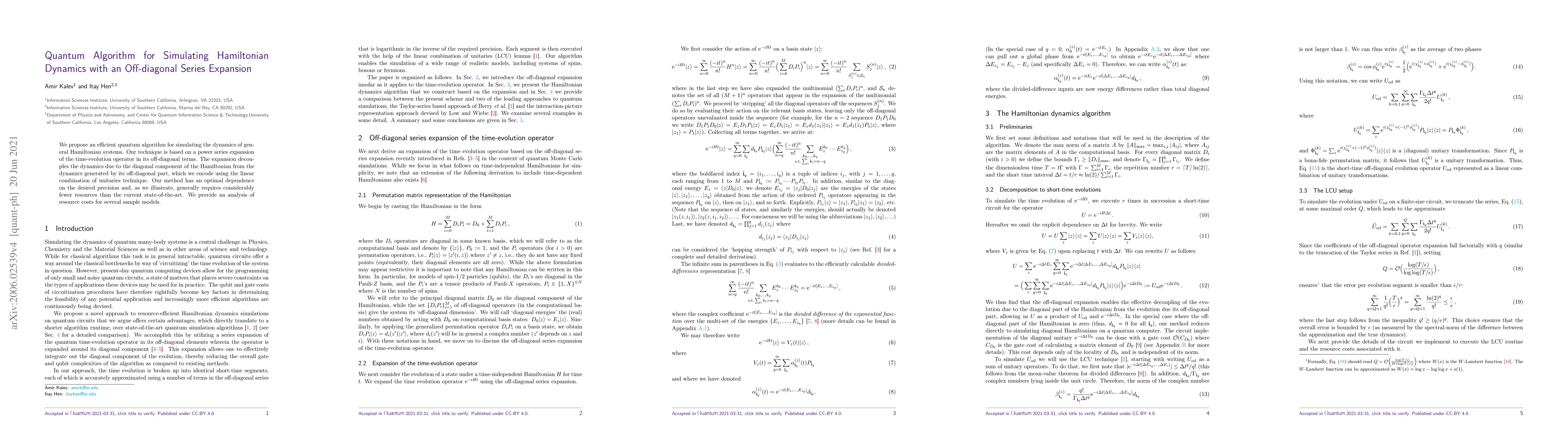 This paper proposes a quantum algorithm for simulating Hamiltonian dynamics using an off-diagonal series expansion, decoupling the dynamics into diagonal and off-diagonal components. The method requires fewer resources than existing techniques and has optimal precision dependence.