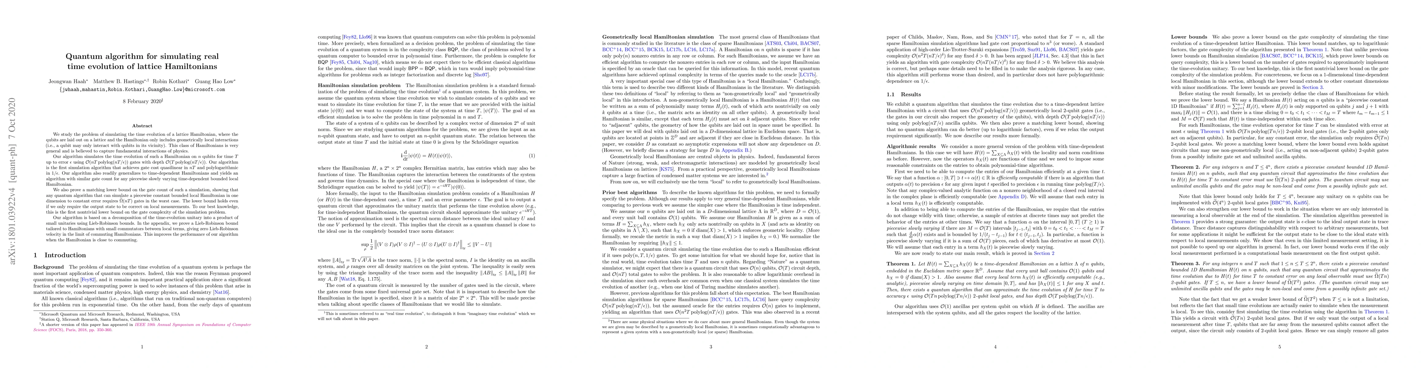 This paper presents a quantum algorithm that efficiently simulates the real-time evolution of lattice Hamiltonians with geometrically local interactions, achieving a quasilinear gate cost in $nT$ and polylogarithmic depth. The authors also establish a matching lower bound for the gate complexity, demonstrating the optimality of their approach.