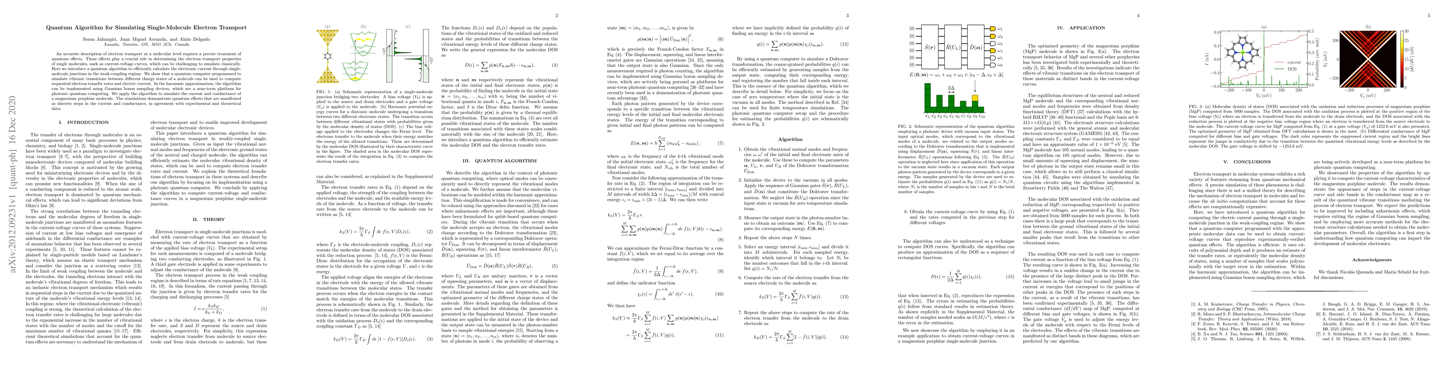 The paper presents a novel quantum algorithm for simulating single-molecule electron transport using Gaussian boson sampling devices, enabling the computation of sequential electron transfer rates and electric current through single-molecule junctions in the weak-coupling regime.