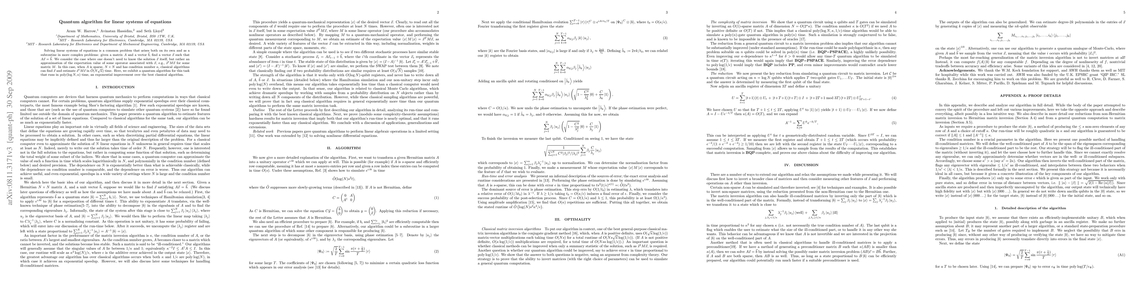 Solving linear systems of equations is a common problem that arises both on its own and as a subroutine in more complex problems: given a matrix A and a vector b, find a vector x such that Ax=b. We consider the case where one doesn't need to know the solution x itself, but rather an approximation of the expectation value of some operator associated with x, e.g., x'Mx for some matrix M. In this case, when A is sparse, N by N and has condition number kappa, classical algorithms can find x and estimate x'Mx in O(N sqrt(kappa)) time. Here, we exhibit a quantum algorithm for this task that runs in poly(log N, kappa) time, an exponential improvement over the best classical algorithm.