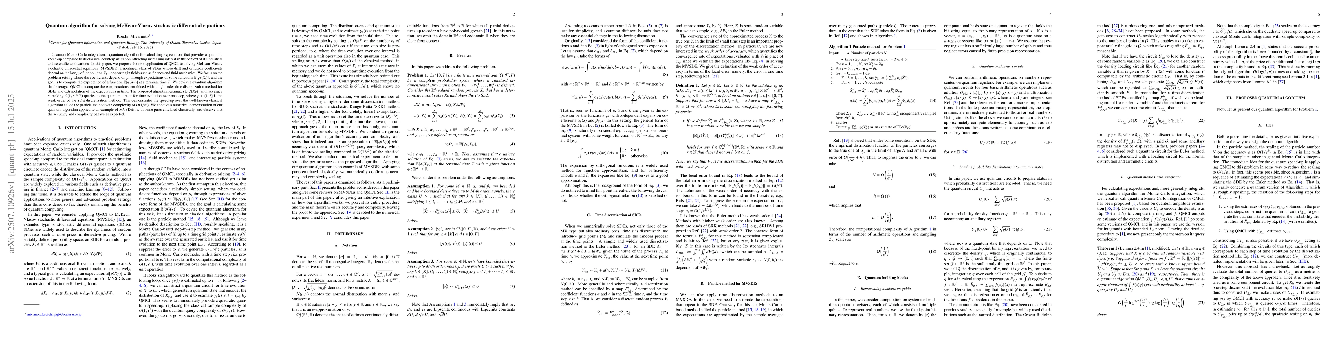 Quantum Monte Carlo integration, a quantum algorithm for calculating expectations that provides a quadratic speed-up compared to its classical counterpart, is now attracting increasing interest in the context of its industrial and scientific applications. In this paper, we propose the first application of QMCI to solving McKean-Vlasov stochastic differential equations (MVSDEs), a nonlinear class of SDEs whose drift and diffusion coefficients depend on the law $\mu_t$ of the solution $X_t$ -- appearing in fields such as finance and fluid mechanics. We focus on the problem setting where the coefficients depend on $\mu_t$ through expectations of some functions $\mathbb{E}[\varphi_k(X_t)]$, and the goal is to compute the expectation of a function $\mathbb{E}[\phi(X_T)]$ at a terminal time $T$. We devise a quantum algorithm that leverages QMCI to compute these expectations, combined with a high-order time discretization method for SDEs and extrapolation of the expectations in time. The proposed algorithm estimates $\mathbb{E}[\phi(X_T)]$ with accuracy $\epsilon$, making $O(1/\epsilon^{1+2/p})$ queries to the quantum circuit for time evolution over one step, where $p\in(1,2]$ is the weak order of the SDE discretization method. This demonstrates the speed-up over the well-known classical algorithm called the particle method with complexity of $O(1/\epsilon^3)$. We conduct a numerical demonstration of our quantum algorithm applied to an example of MVSDEs, with some parts emulated classically, and observe that the accuracy and complexity behave as expected.