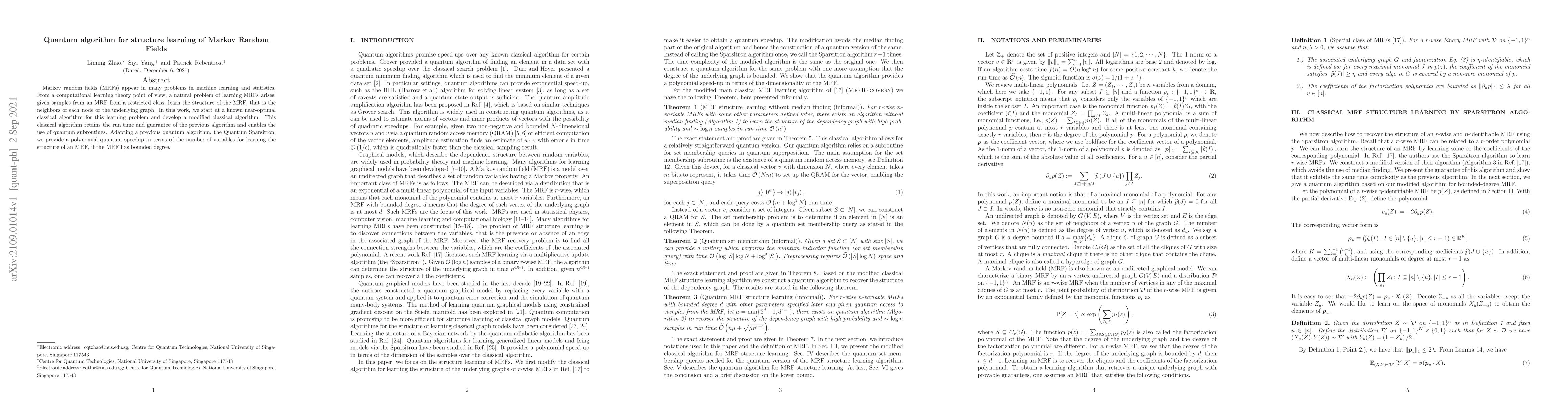 This paper presents a quantum algorithm that provides a polynomial speedup for learning the structure of Markov Random Fields (MRFs) with bounded degree, leveraging a modified classical algorithm and the Quantum Sparsitron quantum subroutine. The approach retains the classical algorithm's runtime and guarantees while enabling quantum computational benefits.