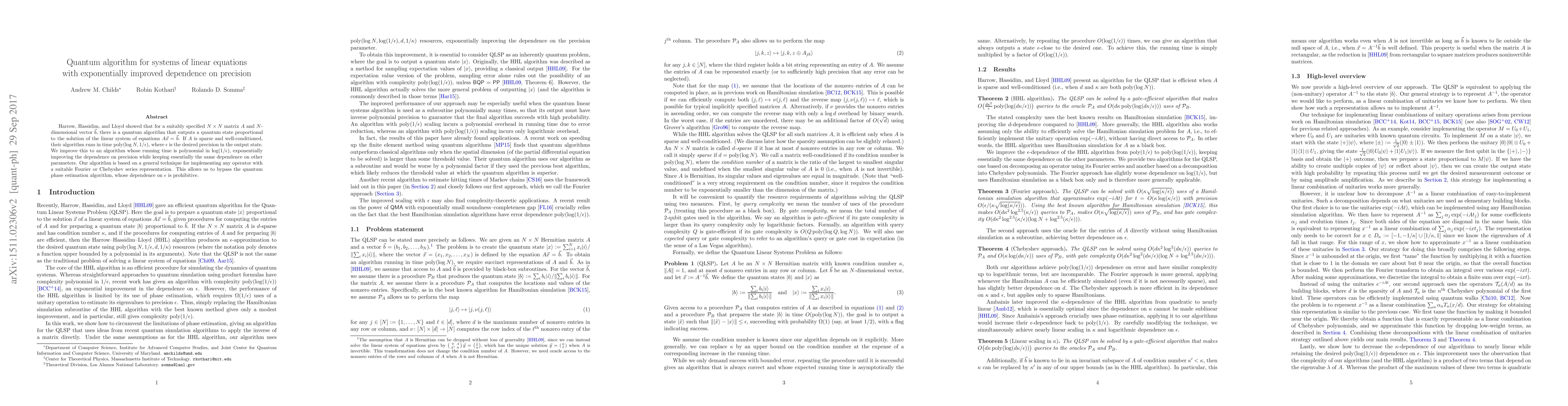 This paper presents a quantum algorithm that solves systems of linear equations with a running time polynomial in $\log(1/\epsilon)$, exponentially improving precision dependence while maintaining similar dependence on other parameters. The improvement is achieved by using a technique to implement operators via Fourier or Chebyshev series, avoiding the limitations of quantum phase estimation.