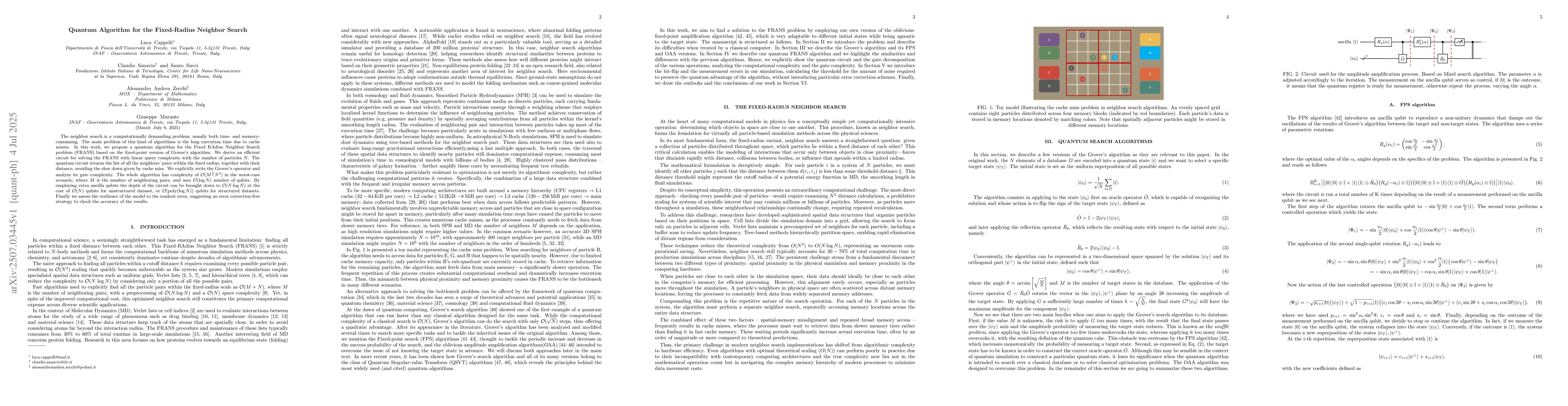 This research proposes a quantum algorithm for Fixed Radius Neighbor Search (FRANS) problem, leveraging a modified Grover's algorithm. It offers linear query complexity with N particles, avoiding cache miss slowdowns. The algorithm's complexity is O(M^0.5 N^2) in worst-case, using O(log N) qubits. Depth can be reduced to O(N log N) with additional qubits, applicable for both unstructured and structured datasets. The paper also explores error resilience, suggesting an error correction-free accuracy verification strategy.