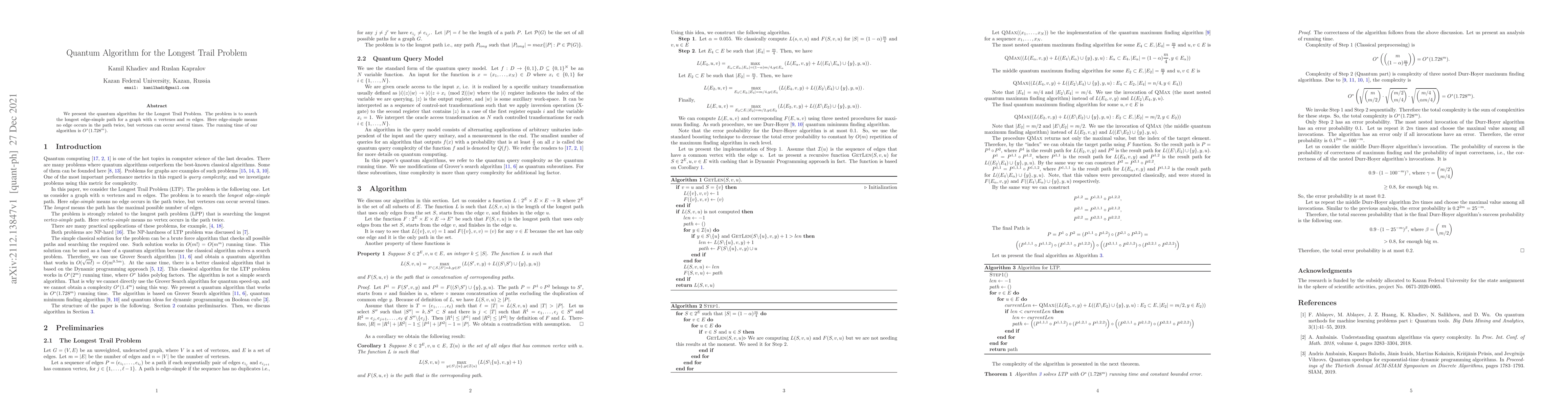 We present the quantum algorithm for the Longest Trail Problem. The problem is to search the longest edge-simple path for a graph with $n$ vertexes and $m$ edges. Here edge-simple means no edge occurs in the path twice, but vertexes can occur several times. The running time of our algorithm is $O^*(1.728^m)$.