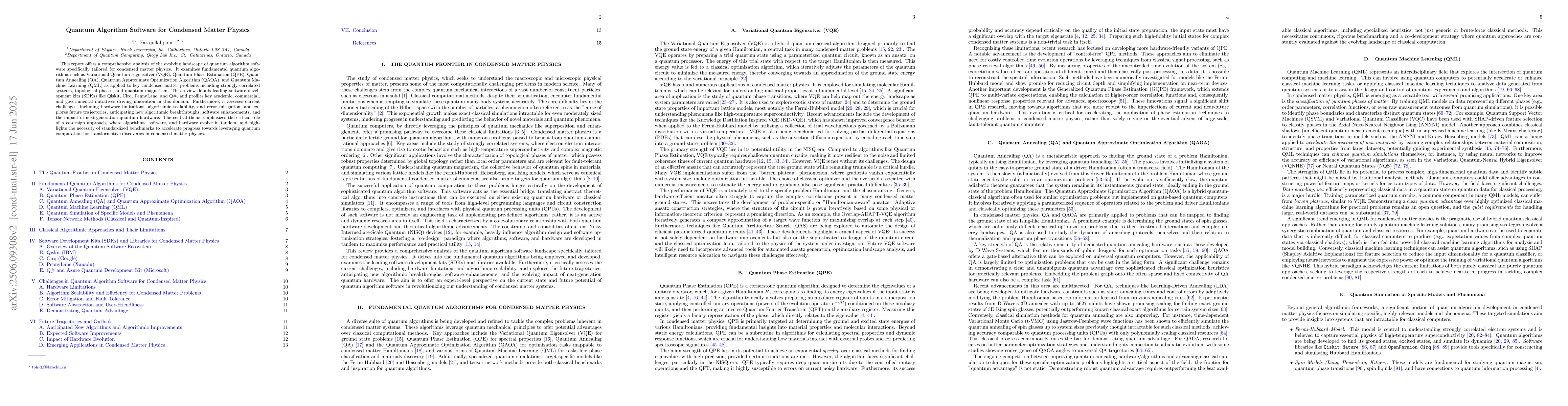 This report offers a comprehensive analysis of the evolving landscape of quantum algorithm software specifically tailored for condensed matter physics. It examines fundamental quantum algorithms such as Variational Quantum Eigensolver (VQE), Quantum Phase Estimation (QPE), Quantum Annealing (QA), Quantum Approximate Optimization Algorithm (QAOA), and Quantum Machine Learning (QML) as applied to key condensed matter problems including strongly correlated systems, topological phases, and quantum magnetism. This review details leading software development kits (SDKs) like Qiskit, Cirq, PennyLane, and Q\#, and profiles key academic, commercial, and governmental initiatives driving innovation in this domain. Furthermore, it assesses current challenges, including hardware limitations, algorithmic scalability, and error mitigation, and explores future trajectories, anticipating new algorithmic breakthroughs, software enhancements, and the impact of next-generation quantum hardware. The central theme emphasizes the critical role of a co-design approach, where algorithms, software, and hardware evolve in tandem, and highlights the necessity of standardized benchmarks to accelerate progress towards leveraging quantum computation for transformative discoveries in condensed matter physics.