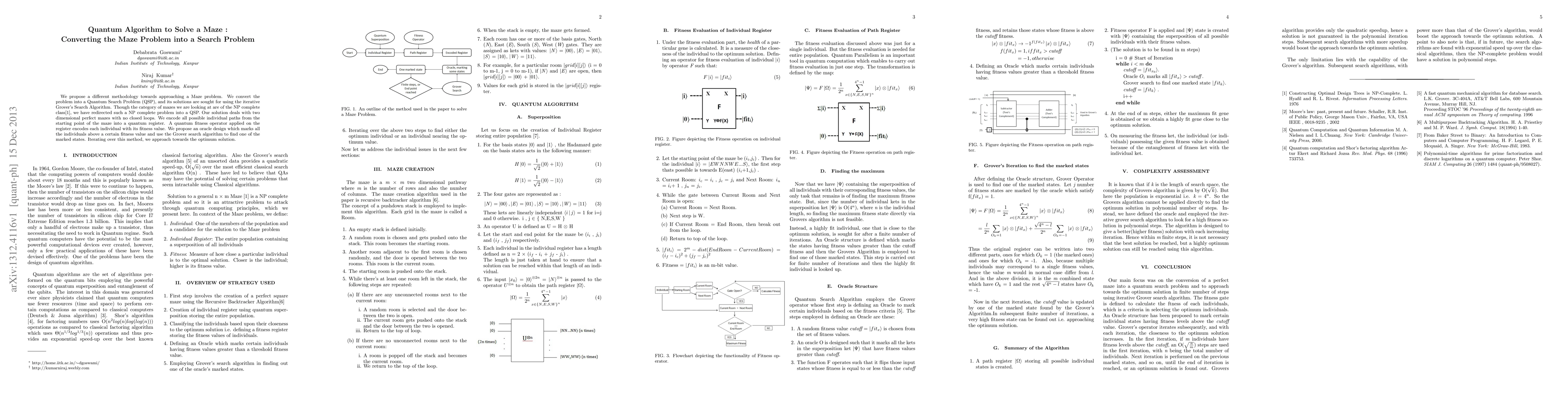 We propose a different methodology towards approaching a Maze problem. We convert the problem into a Quantum Search Problem (QSP), and its solutions are sought for using the iterative Grover's Search Algorithm. Though the category of mazes we are looking at are of the NP complete class, we have redirected such a NP complete problem into a QSP. Our solution deals with two dimensional perfect mazes with no closed loops. We encode all possible individual paths from the starting point of the maze into a quantum register. A quantum fitness operator applied on the register encodes each individual with its fitness value. We propose an oracle design which marks all the individuals above a certain fitness value and use the Grover search algorithm to find one of the marked states. Iterating over this method, we approach towards the optimum solution.