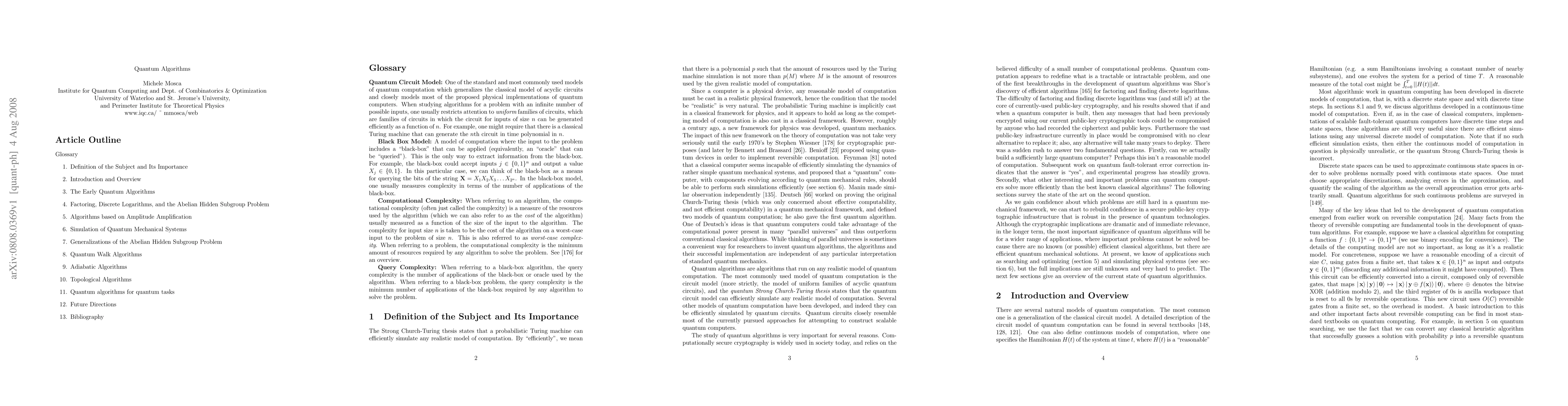 This article surveys the state of the art in quantum computer algorithms, including both black-box and non-black-box results. It is infeasible to detail all the known quantum algorithms, so a representative sample is given. This includes a summary of the early quantum algorithms, a description of the Abelian Hidden Subgroup algorithms (including Shor's factoring and discrete logarithm algorithms), quantum searching and amplitude amplification, quantum algorithms for simulating quantum mechanical systems, several non-trivial generalizations of the Abelian Hidden Subgroup Problem (and related techniques), the quantum walk paradigm for quantum algorithms, the paradigm of adiabatic algorithms, a family of ``topological'' algorithms, and algorithms for quantum tasks which cannot be done by a classical computer, followed by a discussion.