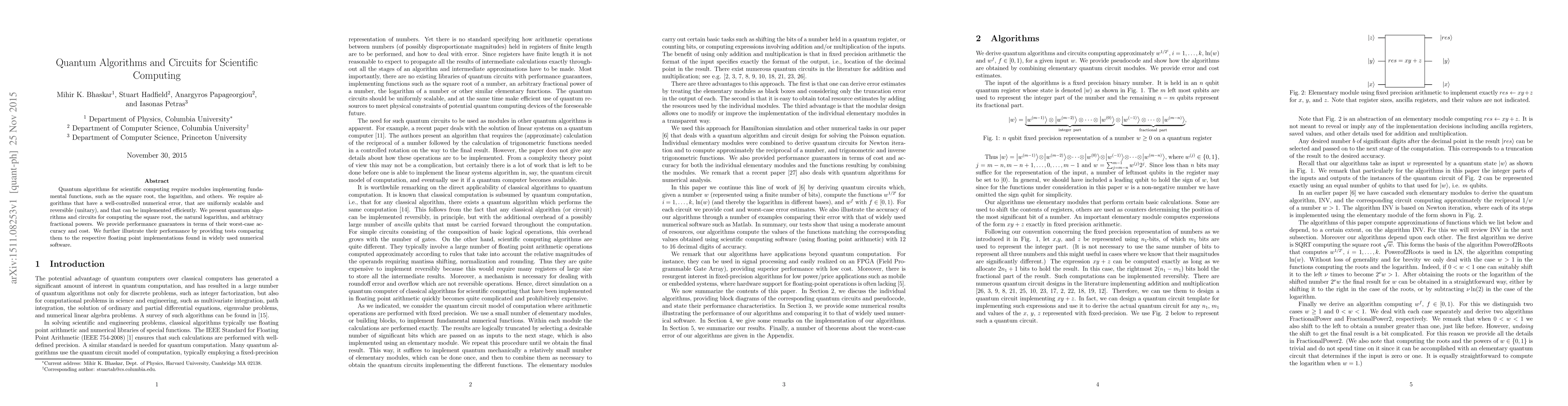 Quantum algorithms for scientific computing require modules implementing fundamental functions, such as the square root, the logarithm, and others. We require algorithms that have a well-controlled numerical error, that are uniformly scalable and reversible (unitary), and that can be implemented efficiently. We present quantum algorithms and circuits for computing the square root, the natural logarithm, and arbitrary fractional powers. We provide performance guarantees in terms of their worst-case accuracy and cost. We further illustrate their performance by providing tests comparing them to the respective floating point implementations found in widely used numerical software.