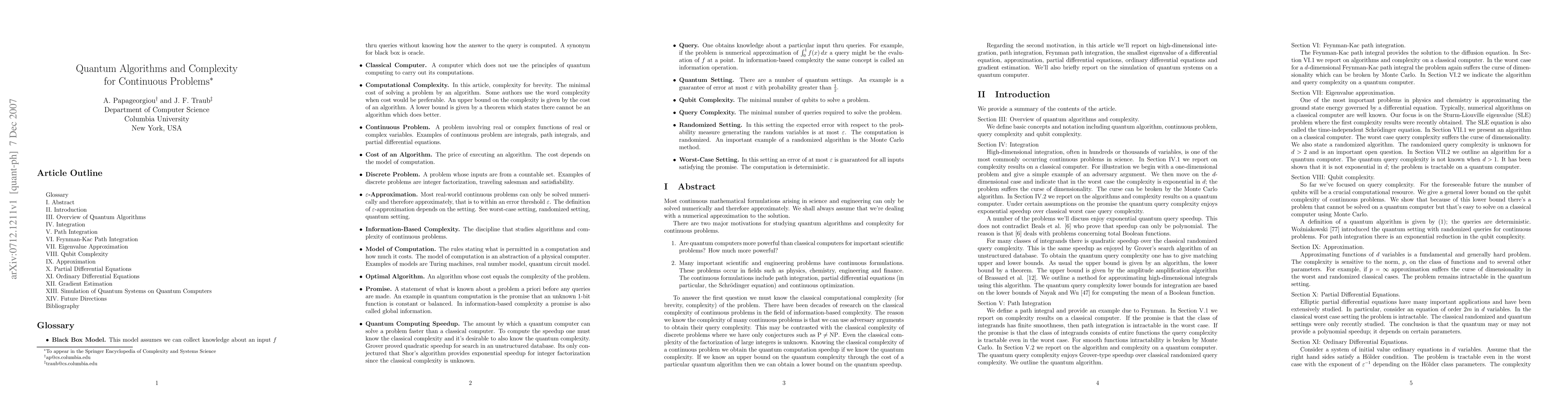 Most continuous mathematical formulations arising in science and engineering can only be solved numerically and therefore approximately. We shall always assume that we're dealing with a numerical approximation to the solution. There are two major motivations for studying quantum algorithms and complexity for continuous problems. 1. Are quantum computers more powerful than classical computers for important scientific problems? How much more powerful? 2. Many important scientific and engineering problems have continuous formulations. To answer the first question we must know the classical computational complexity of the problem. Knowing the classical complexity of a continuous problem we obtain the quantum computation speedup if we know the quantum complexity. If we know an upper bound on the quantum complexity through the cost of a particular quantum algorithm then we can obtain a lower bound on the quantum speedup. Regarding the second motivation, in this article we'll report on high-dimensional integration, path integration, Feynman path integration, the smallest eigenvalue of a differential equation, approximation, partial differential equations, ordinary differential equations and gradient estimation. We'll also briefly report on the simulation of quantum systems on a quantum computer.